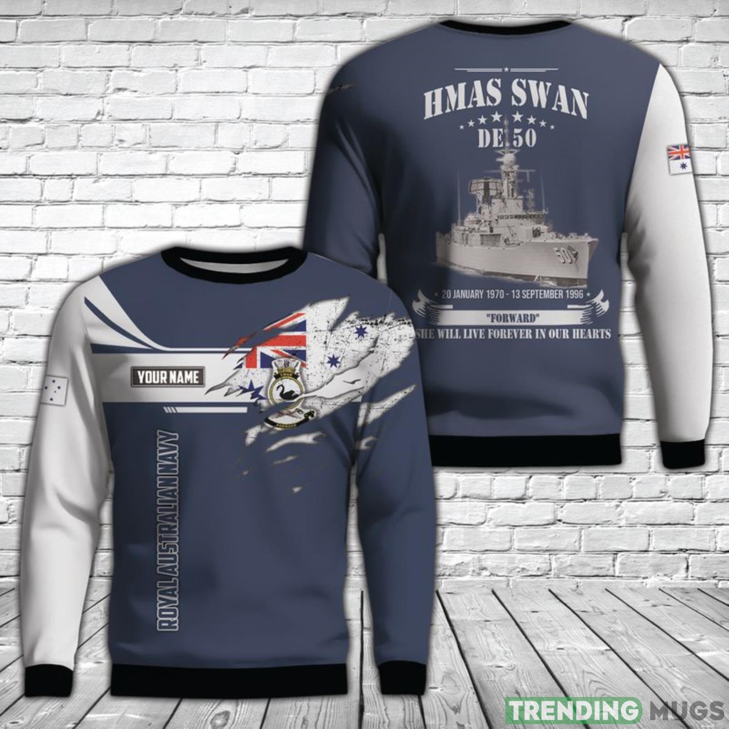 Crafted with the utmost attention to detail, this sweater features a unique all-over print design that proudly displays the iconic RAN HMAS Swan (DE 50) ship. The custom name option allows you to personalize this sweater, making it an extra special gift for yourself or a loved one.