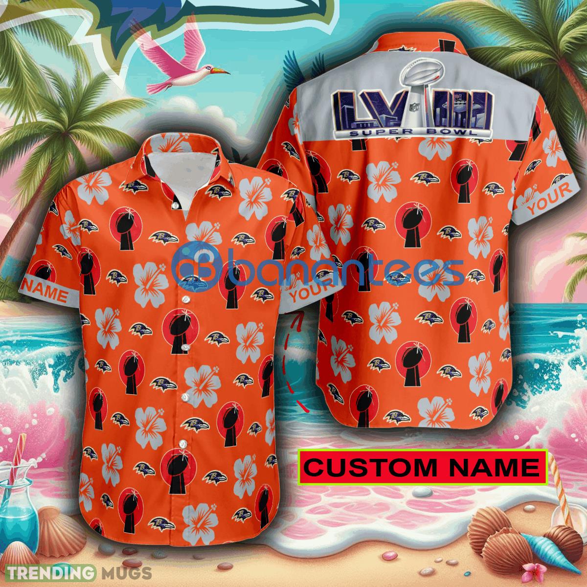 Custom Name Super Bowl 2024 Baltimore Ravens Orange Hawaiian Shirt Trends For Men Women Gift Details: