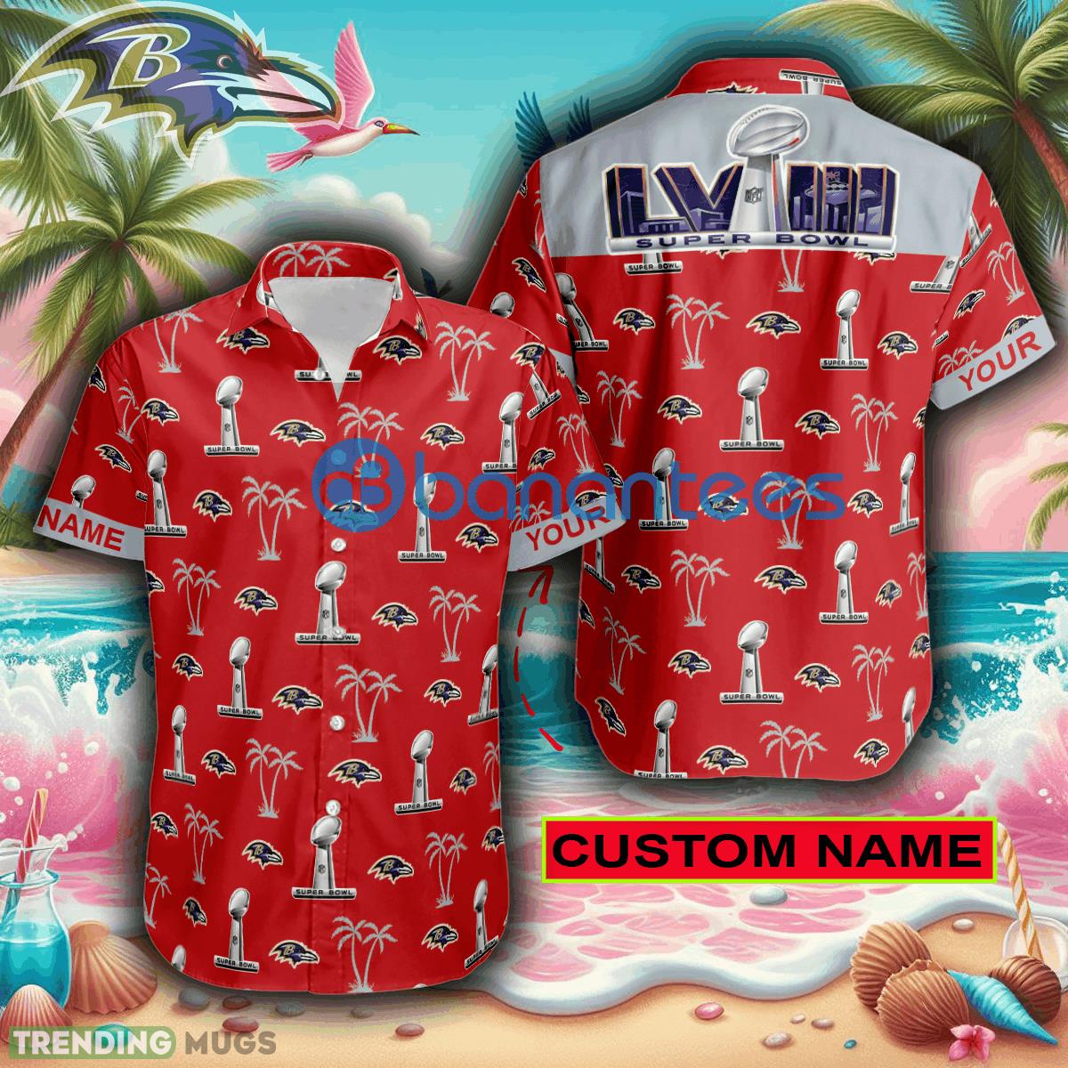 Custom Name Super Bowl LVIII Baltimore Ravens Red Hawaiian Shirt Trends For Men Women Gift Details: