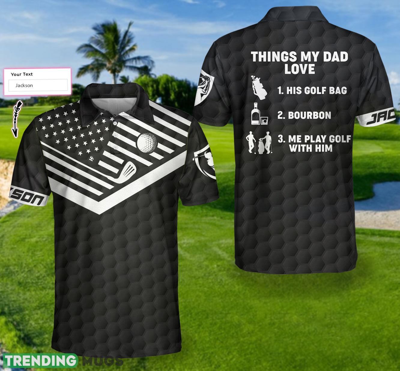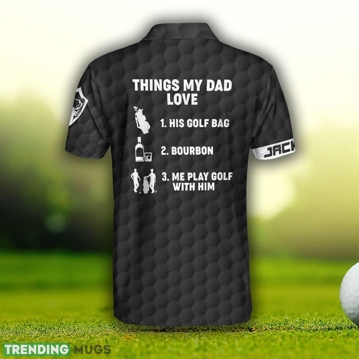 Make your dad feel like a golfing legend with our Custom Name Things My Dad Love Golfing And Bourbon Golf Shirt Polo Shirt! This unique and personalized polo shirt is the perfect gift for any golf enthusiast who also enjoys a fine glass of bourbon.