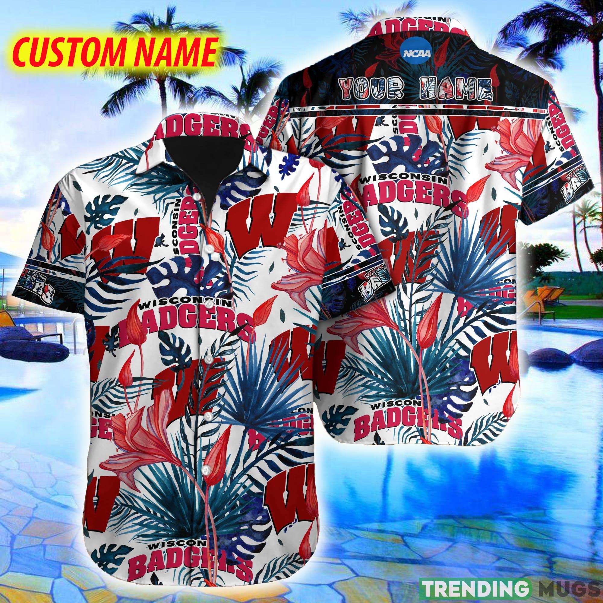 Some of the Custom Name Wisconsin Badgers NCAA Logo Leaf And Flowers Hawaiian Shirt New For Fans Gift photos