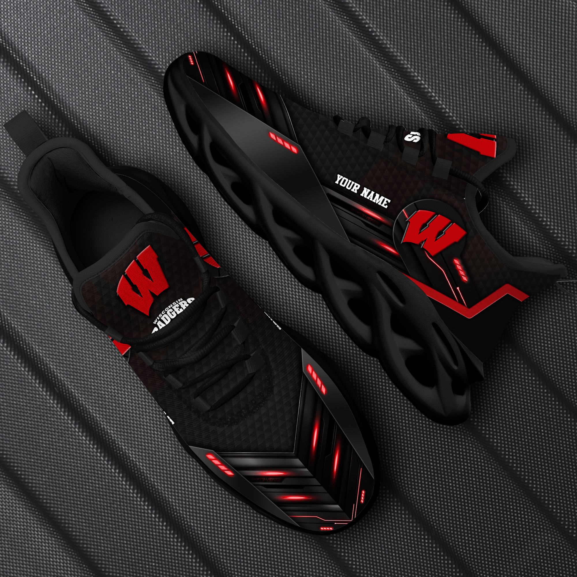 This Custom Name Wisconsin Badgers Team Black Design Sports Sneakers Ideas For Men And Women Gift Max Soul Shoes is a breathable, lightweight, and comfortable casual outdoor shoe that has a unique design. It is made of a mesh fabric which makes it sweat absorbent and breathable, while the rubber bottom ensures traction, comfort, and durability. It is available in two colors: black or white sole. There are two styles of shoelace holes so you can choose your preference.