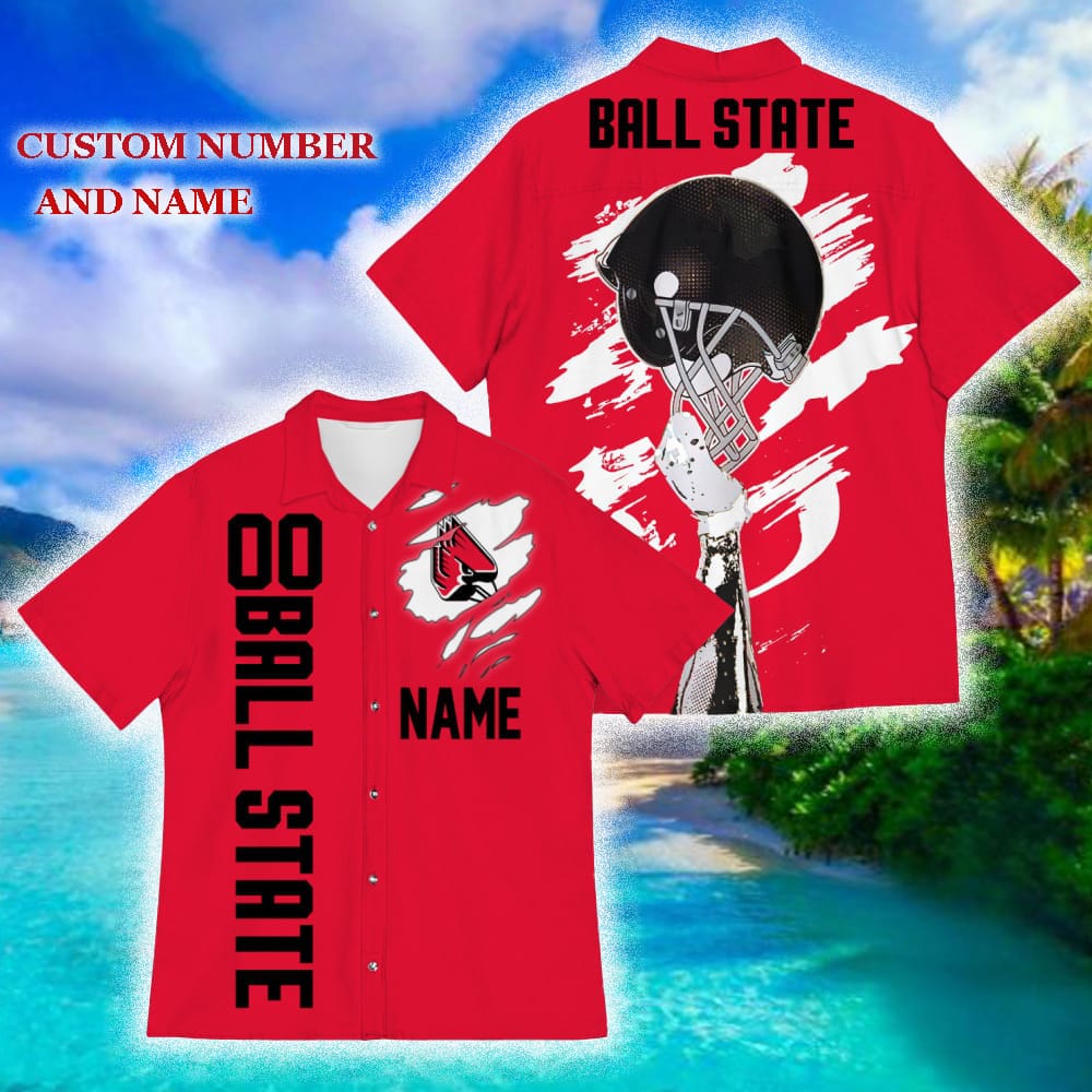 Embrace the latest trends and show off your team pride in a bold and fashionable way. Our Custom Number And Name Ball State Cardinals Sports American Hawaiian Football Helmet New Trends For Fans Club Gifts 3D Hawaiian Shirt Aloha Beach is the ultimate fusion of sports and style. Get yours today and take your fan game to a whole new level!