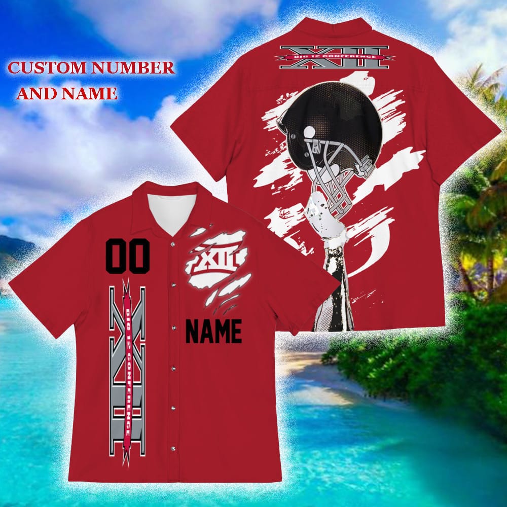 Get ready to show off your team spirit in style with our Custom Number And Name Big 12 Conference Sports American Hawaiian Football Helmet New Trends For Fans Club Gifts 3D Hawaiian Shirt Aloha Beach!
