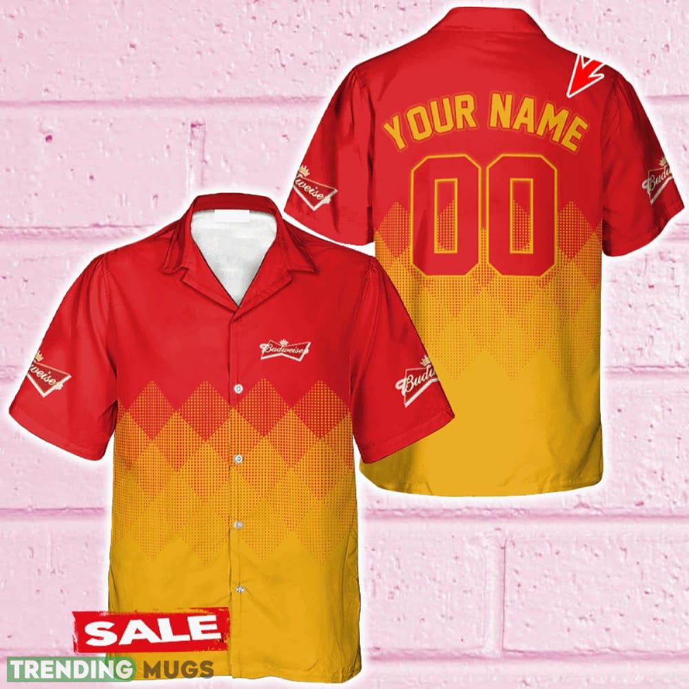 Custom Number And Name Budweiser Beer Yellow And Red Halftone Hawaiian Shirt Beer For Men Women Summer Beach Details: