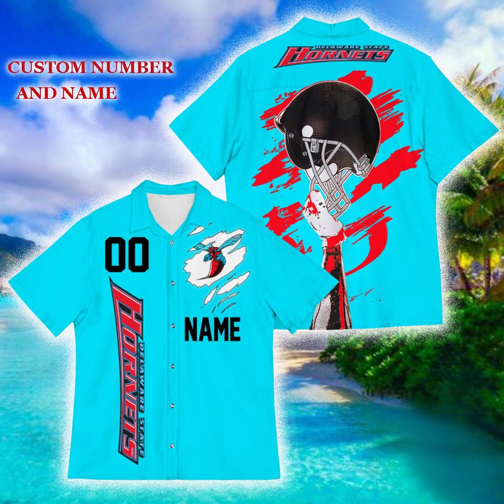 Custom Number And Name Delaware State Hornets Sports American Hawaiian Football Helmet New Trends For Fans Club Gifts 3D Hawaiian Shirt Aloha Beach Details: