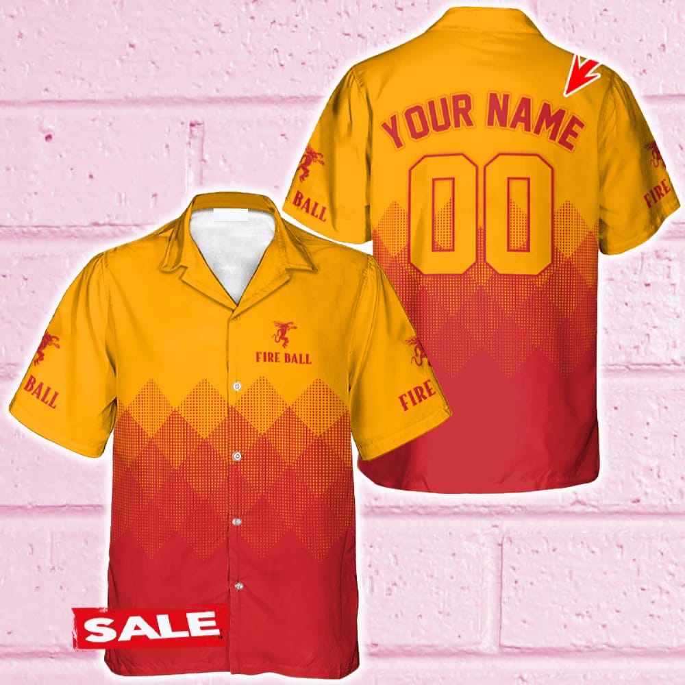 Custom Number And Name Fireball Whiskey Red And Yellow Halftone Hawaiian Shirt Beer For Men Women Summer Beach Details: