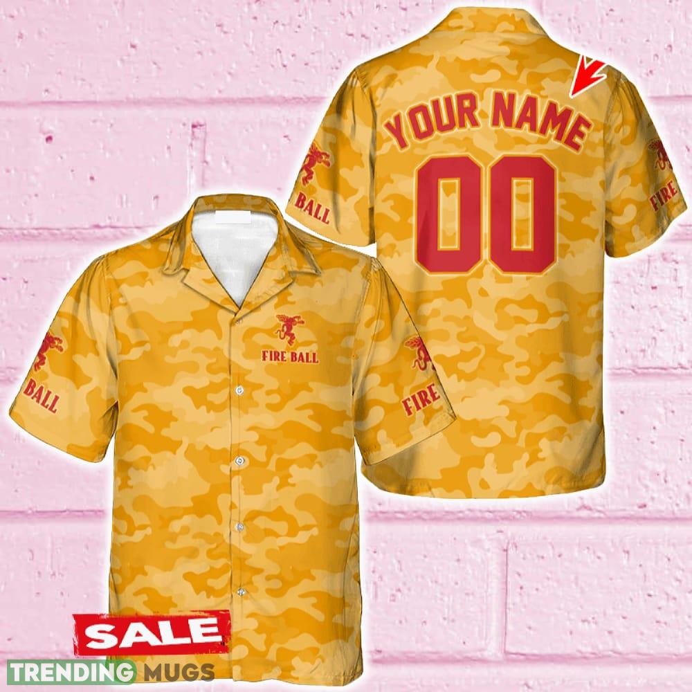 Custom Number And Name Fireball Whiskey Yellow Camouflage Hawaiian Shirt Beer For Men Women Summer Beach Hawaiian Shirt