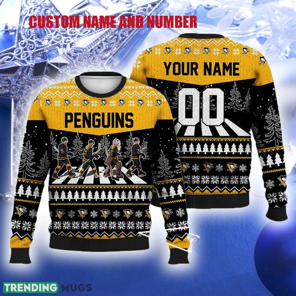 Get ready to rock around the Christmas tree in style with our Custom Number And Name Penguins Walking Abbey Road Ugly Christmas Sweater! Perfect for ice hockey fans and families alike, this festive sweater combines your love for the sport and the holiday season in a unique and eye-catching design.
