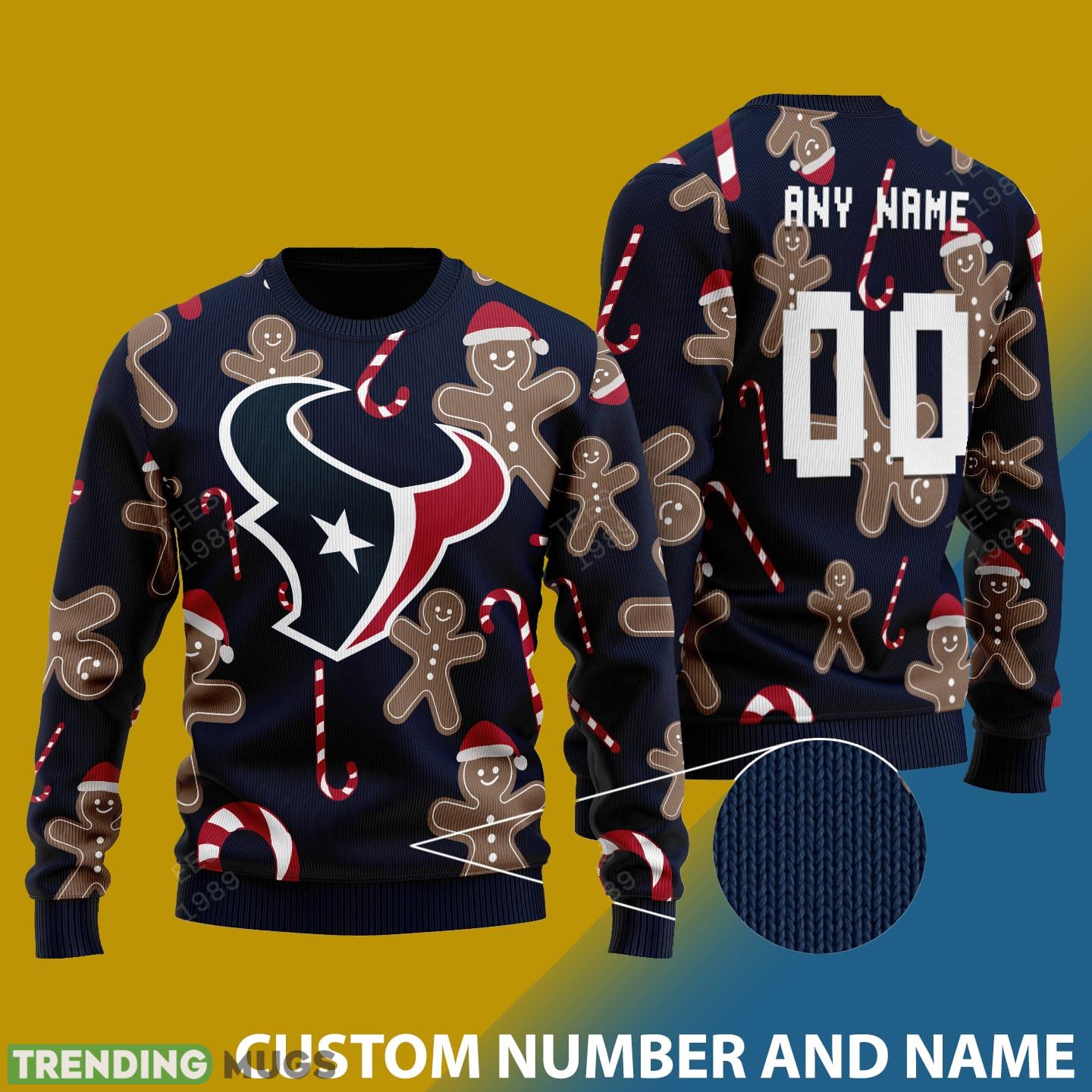 Featuring a vibrant design of a jolly Santa bear donning the iconic Texans colors, this sweater is sure to be a hit at any holiday gathering. The custom number and name add a personal touch, making it a unique and thoughtful gift for any Texans fan.
