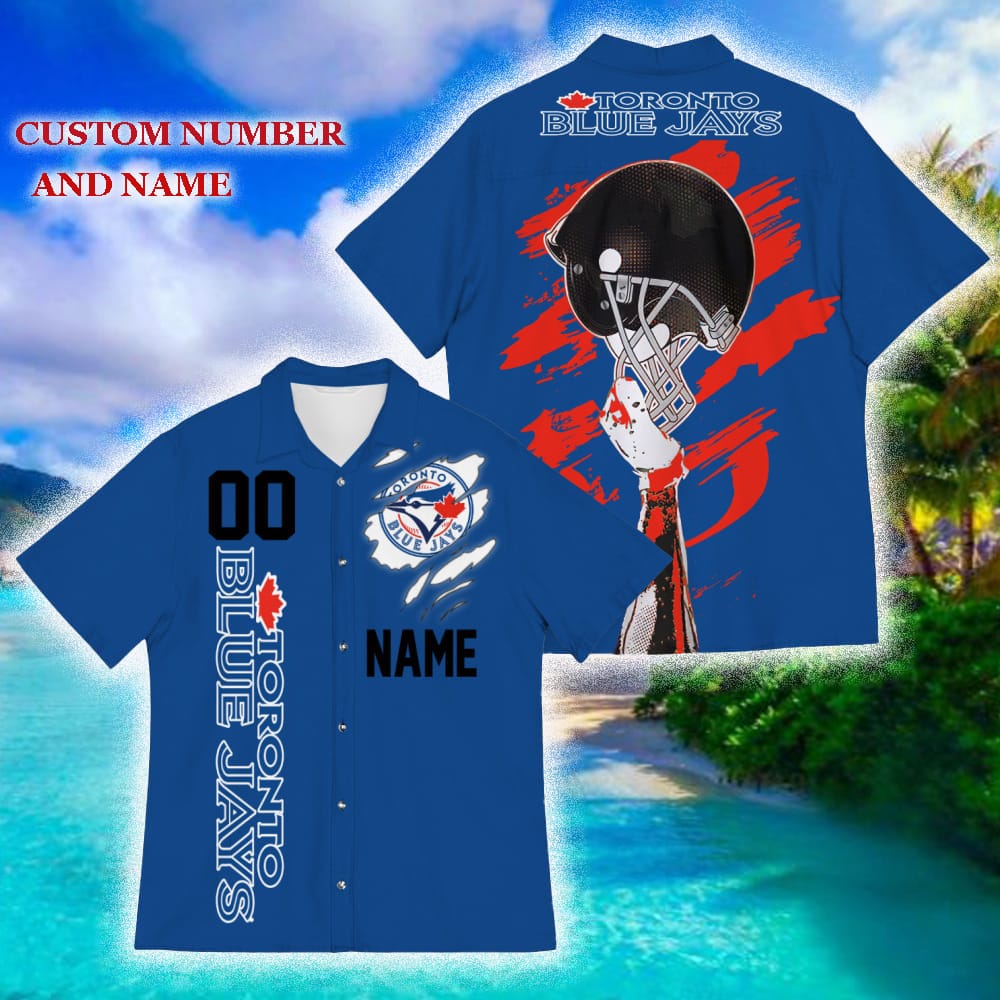 Step up your game and show off your love for the Toronto Blue Jays with our Custom Number And Name Toronto Blue Jays Sports American Hawaiian Football Helmet New Trends For Fans Club Gifts 3D Hawaiian Shirt Aloha Beach.