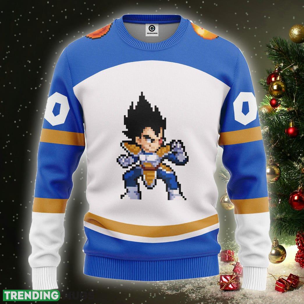 With its vibrant colors and intricate design, this sweater showcases everyone’s favorite Saiyan prince, Vegeta, in a fun and festive way. The iconic DBZ logo is beautifully integrated into the Christmas theme, making it a must-have for any fan of the series.