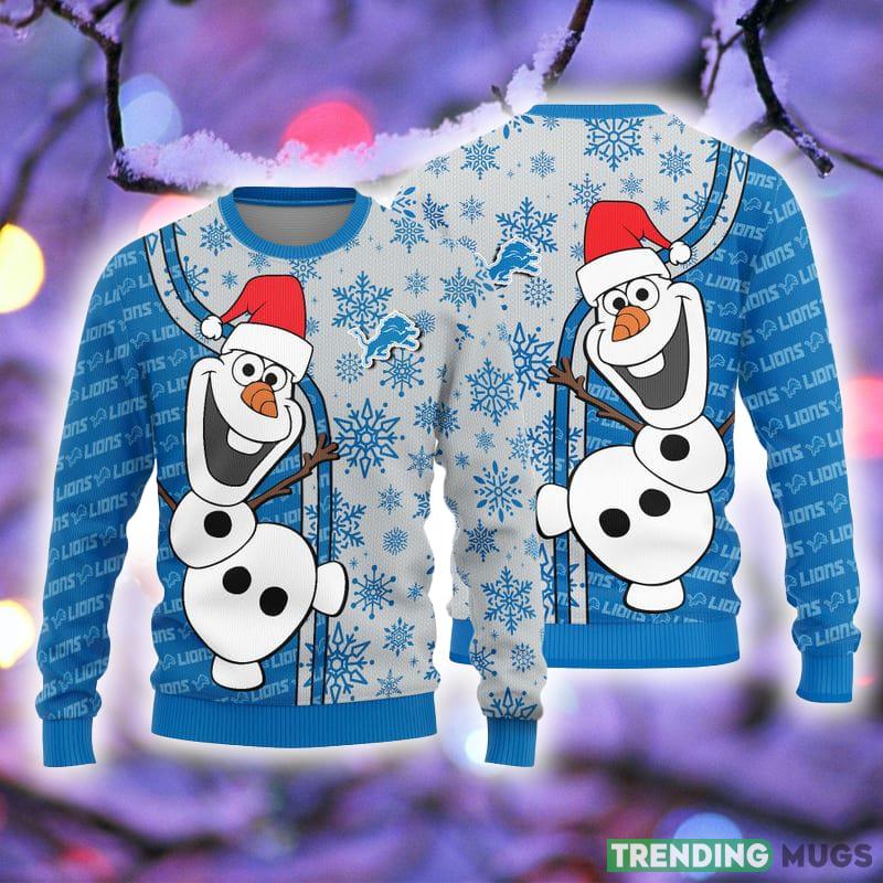 Featuring the lovable snowman Olaf from Frozen, dressed in the iconic blue and silver colors of the Detroit Lions, this sweater is a unique and playful twist on the traditional ugly Christmas sweater. The all-over print design ensures that every inch of this sweater is filled with holiday spirit.