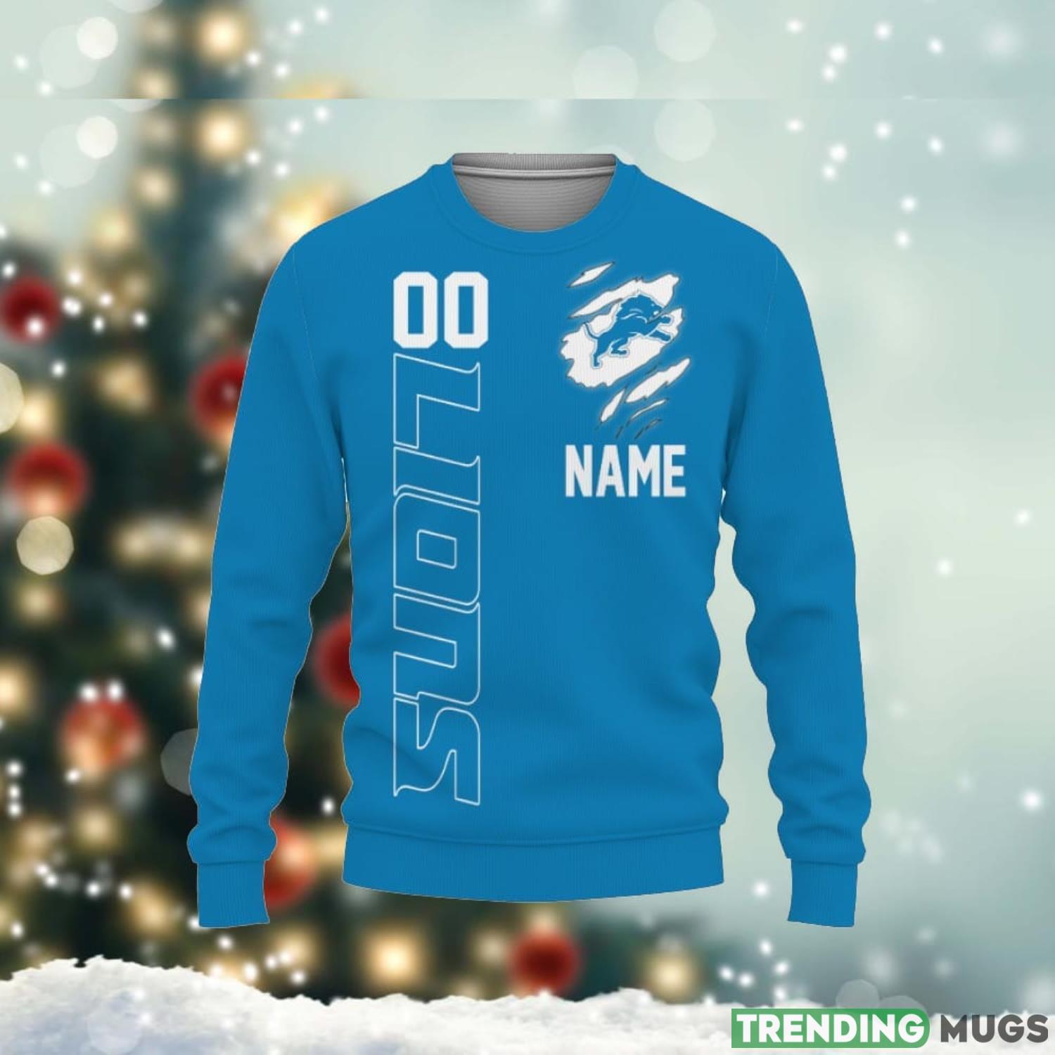 Crafted with exquisite attention to detail, this sweater features an eye-catching 3D design of the iconic Detroit Lions helmet. The custom name and number on the back give it a personalized touch, making it a truly unique gift. Whether you’re attending a game or just want to showcase your team spirit, this sweater is a must-have addition to your wardrobe.
