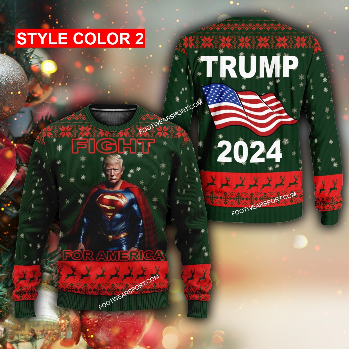 Show your support for President Donald Trump in style with this eye-catching sweater featuring a bold design of Trump donning a resplendent Superman outfit. The vibrant forest green color and 3D detailing make this sweater truly stand out from the crowd. Perfect for fans looking to make a statement, this sweater is sure to turn heads and spark conversations wherever you go. Stay on trend and show your support with this hot, trending piece. Add this unique sweater to your wardrobe today and let your Trump fandom shine!