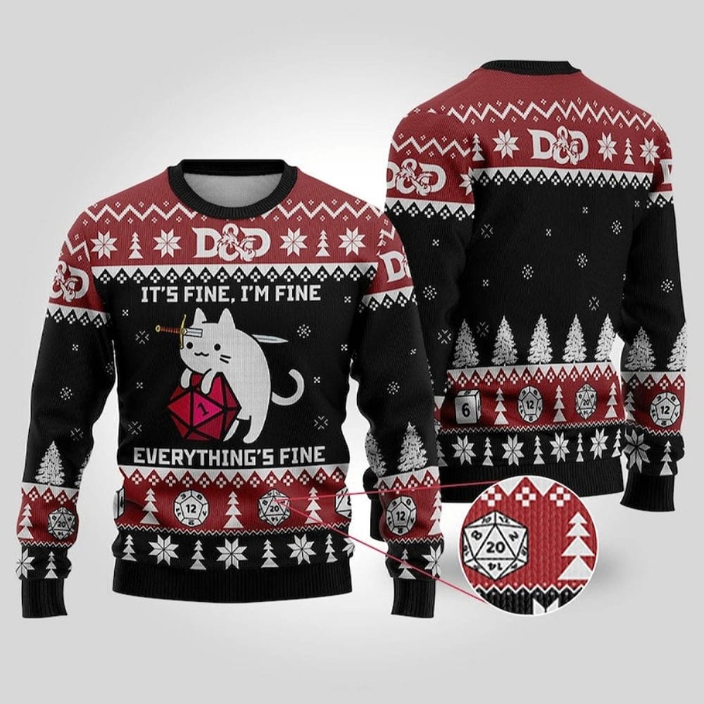 Dungeons and Dragons Christmas Ugly Sweater Cat DND Dice Game It’s Fine I’m Fine Everything is Fine Shirt Xmas Gifts Informations: