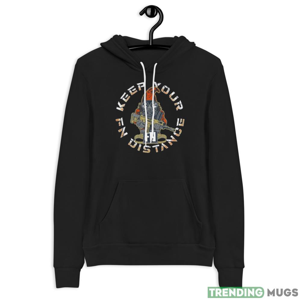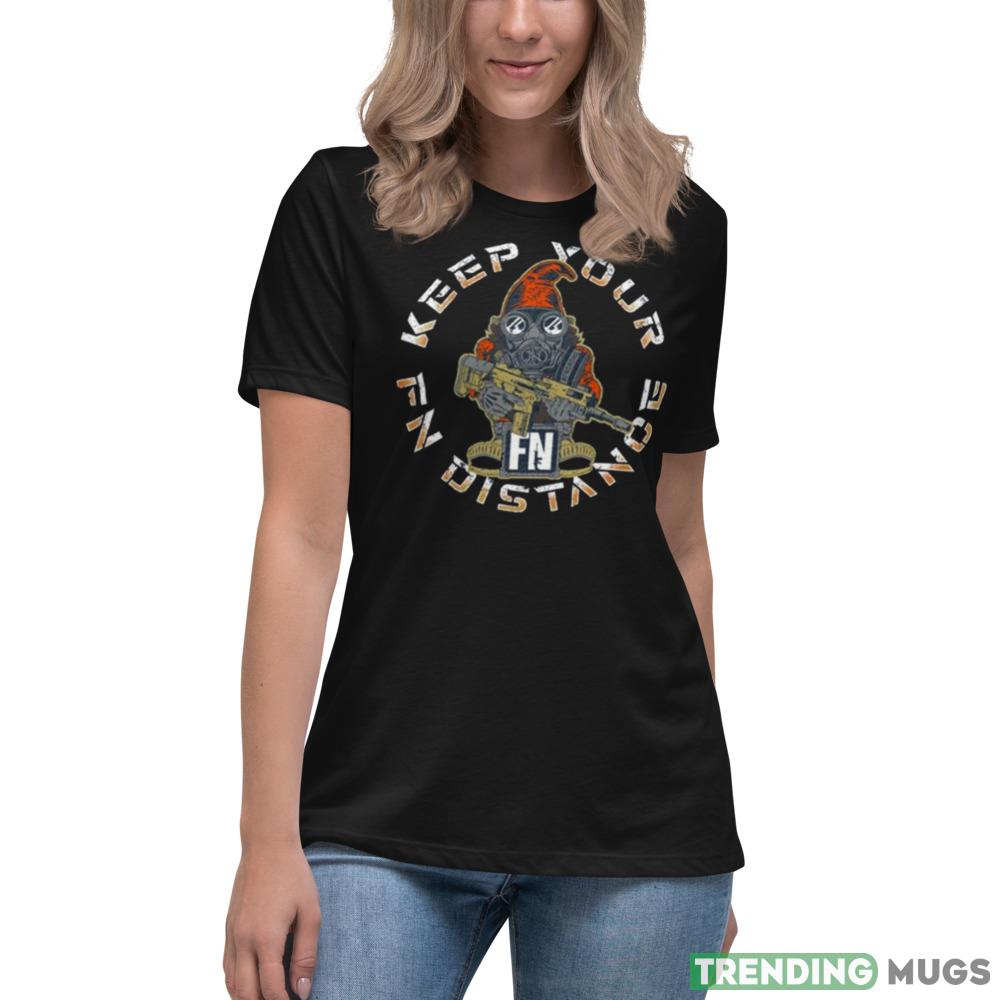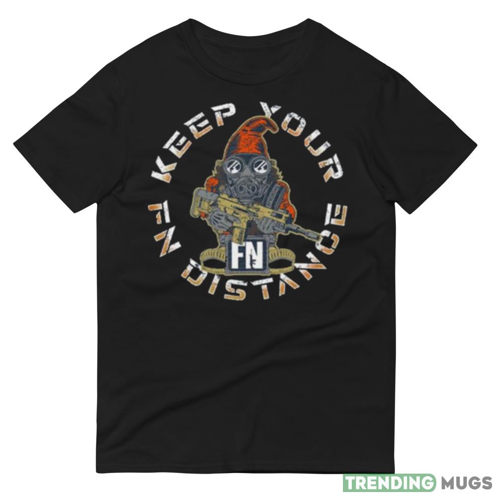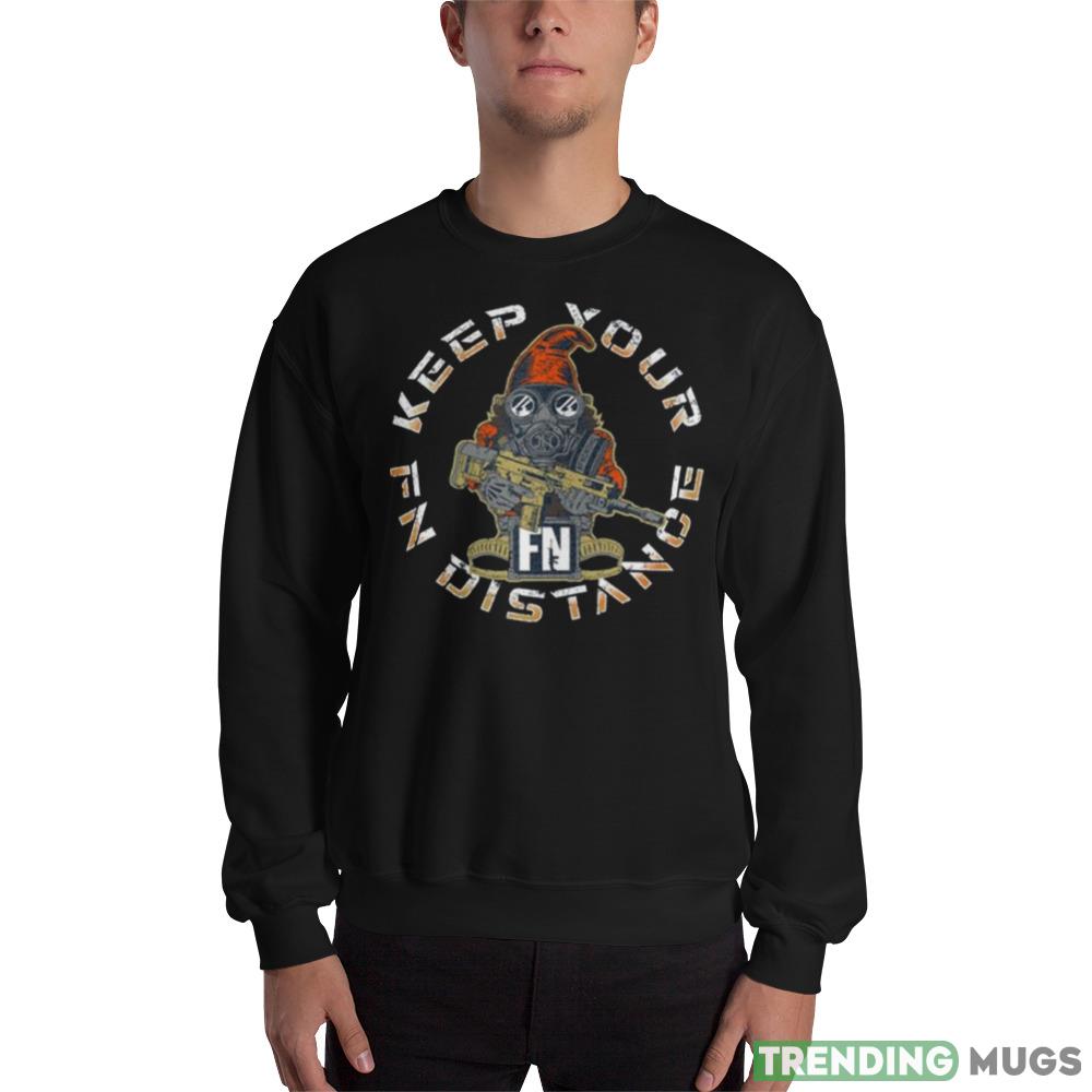Crafted from high-quality materials and built to last, this shirt features a one-of-a-kind design that is sure to turn heads and spark conversations wherever you go. The shirt prominently displays the iconic Fallout 2.0 Gnome, along with the cheeky “Keep Your FN Distance” slogan, making it a must-have for any true fan of the series.