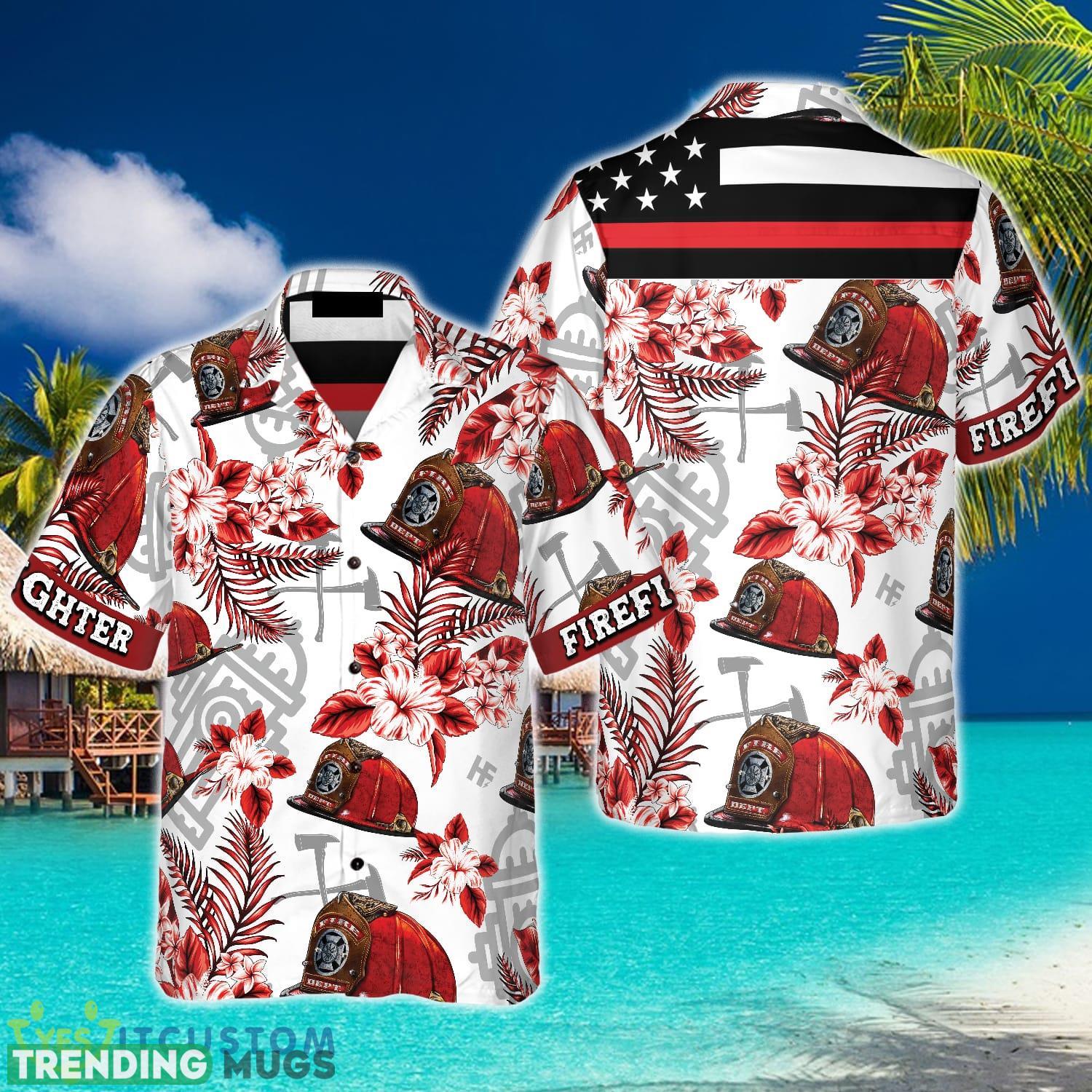 Crafted with high-quality materials, our Hawaiian shirt features a striking design of a red firefighter helmet against a black American flag backdrop. The 3D effect adds depth and an eye-catching element, making this shirt truly unique.