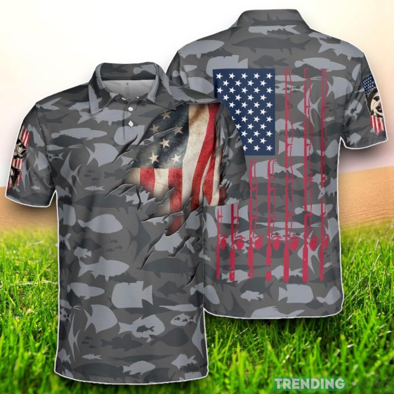 Order your Fish Collection Under The Sea Fishing American Flag Camo Polo Shirt today and let your passion for fishing and patriotism shine through your wardrobe!