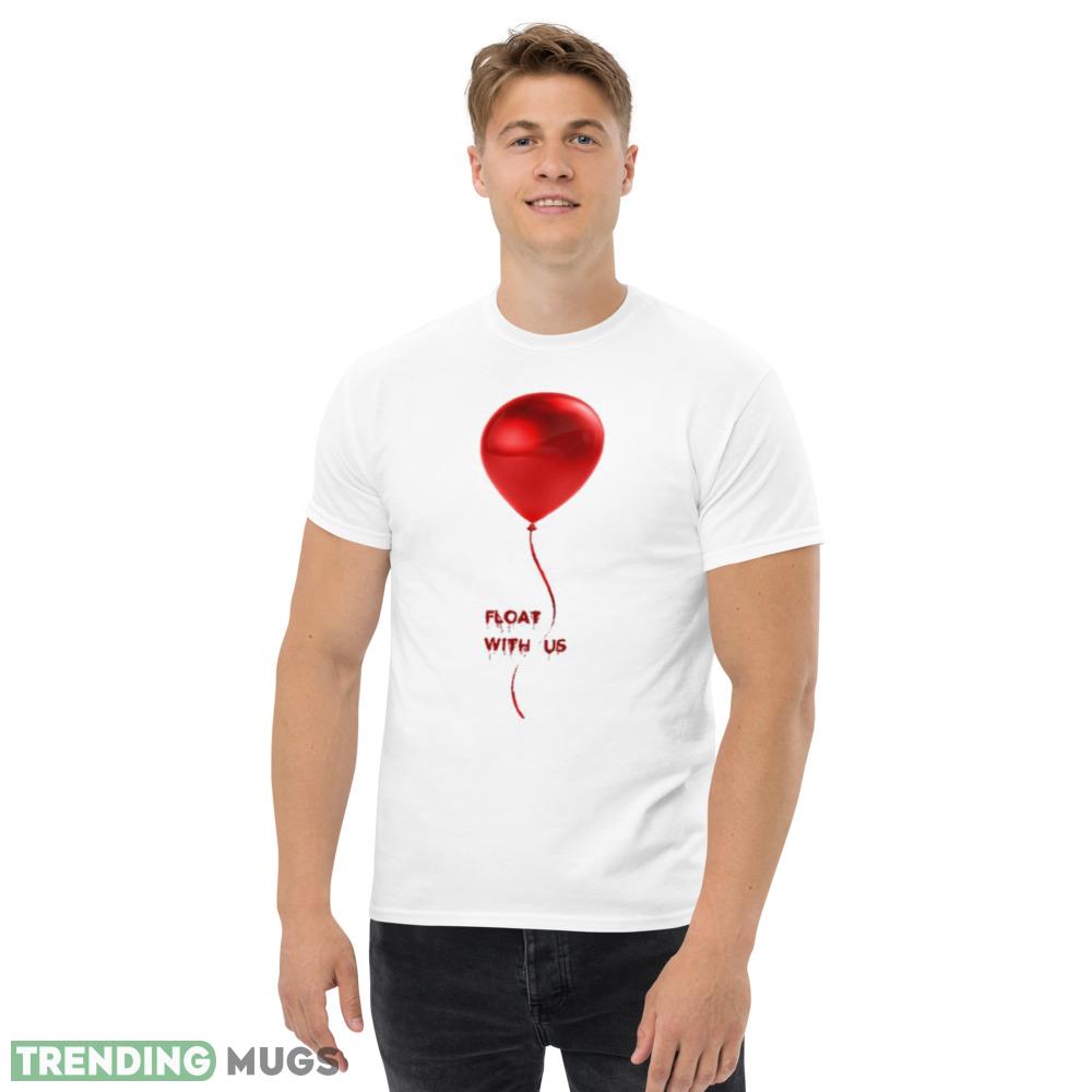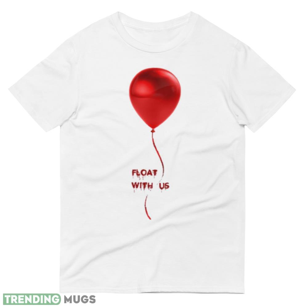 Step right up and get your hands on the Float With Us It Clown Movie White T-Shirt. This one-of-a-kind item is perfect for fans of the iconic horror movie, It. The white tee features a bold graphic of the infamous clown, Pennywise, floating in a sea of red balloons.