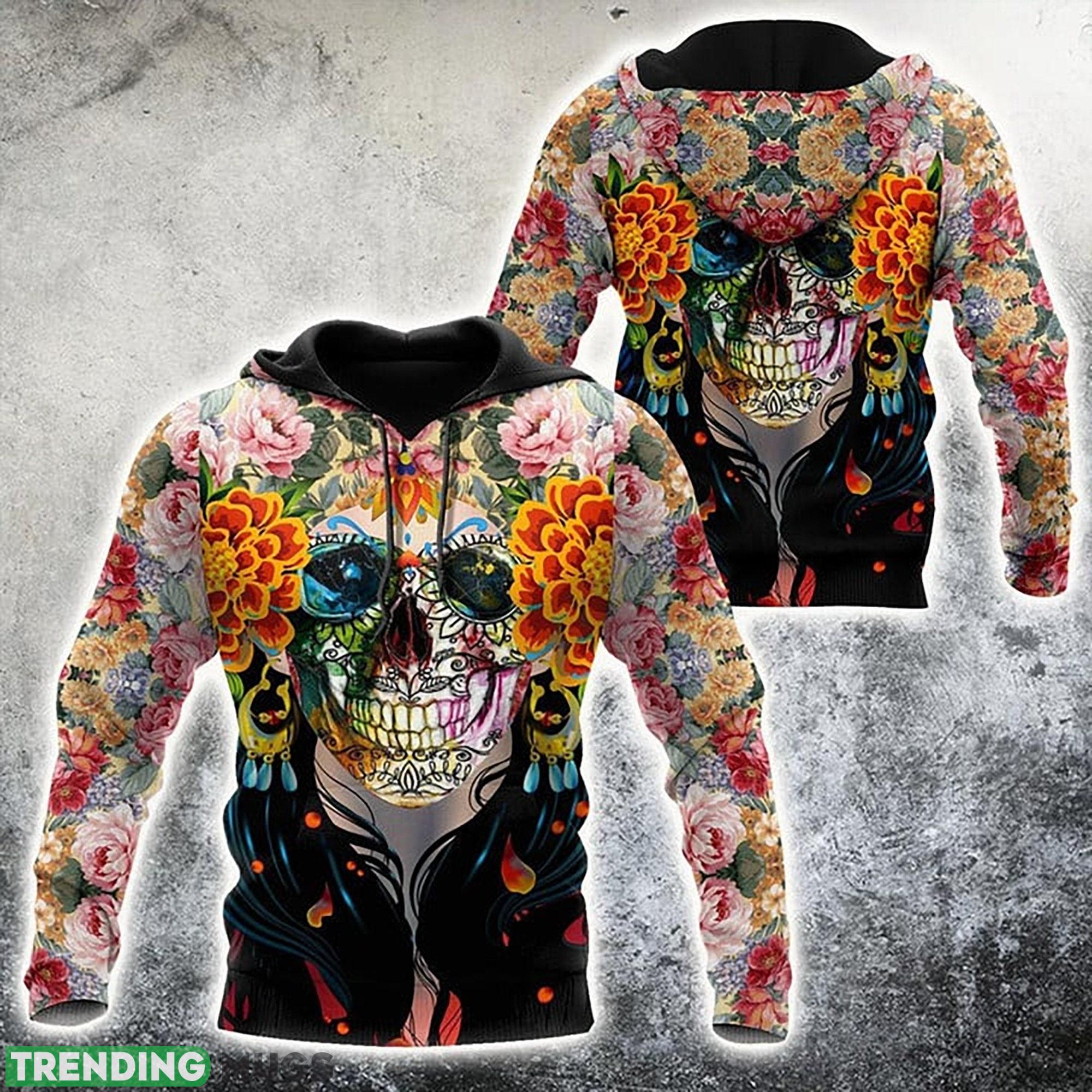 Crafted from premium quality polyester and spandex materials, this hoodie features an all-over 3D print design that covers the entire surface, giving it a bold and eye-catching look. The print features an intricate and detailed combination of floral patterns and a striking skull design, creating a perfect blend of beauty and darkness.