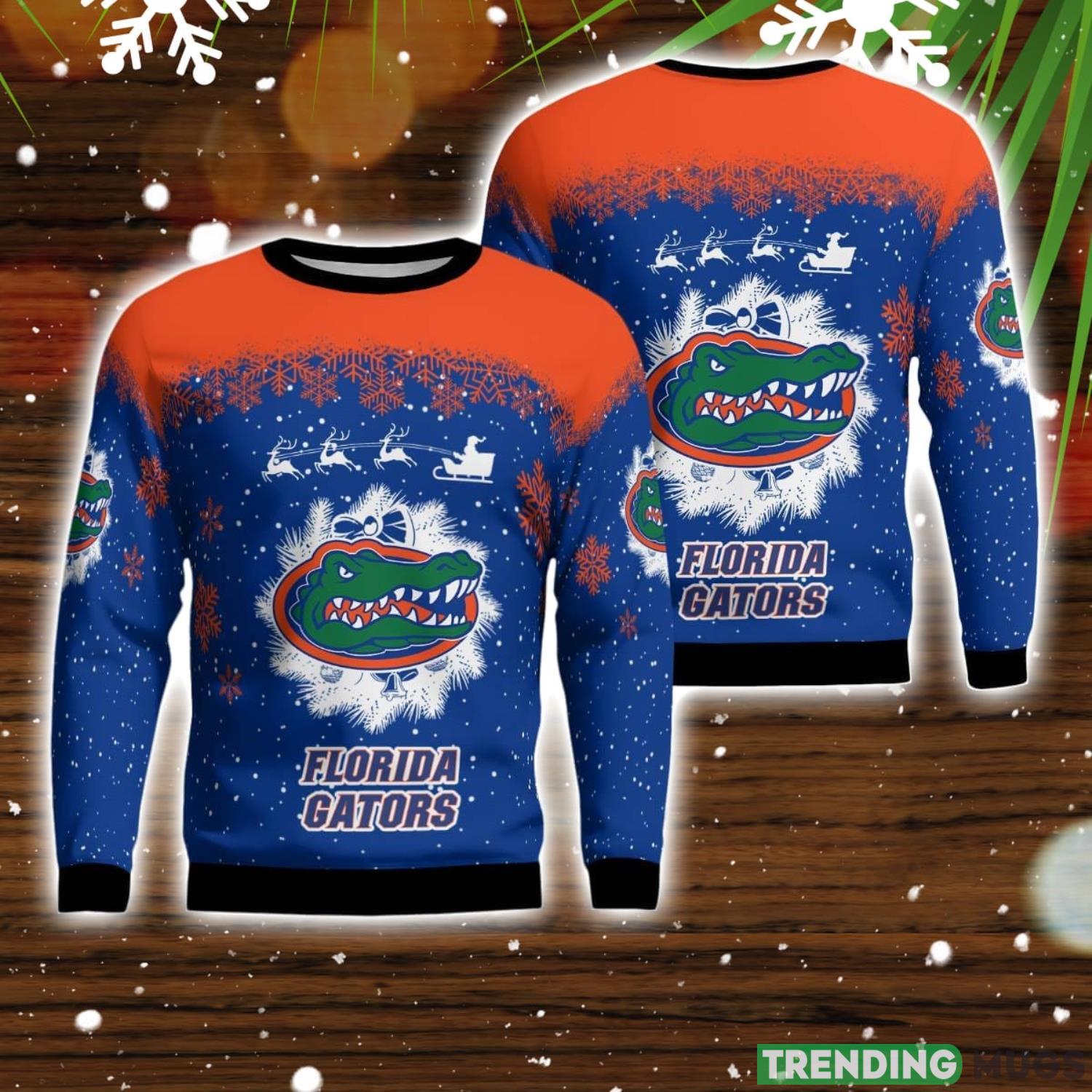 Designed with the Florida Gators fan in mind, this sweater features a playful pattern of Santa Claus in his sleigh, being driven by adorable reindeer, all adorned with the iconic team colors and logo. The intricate detailing and vibrant colors make this sweater a truly unique and standout addition to your holiday wardrobe.