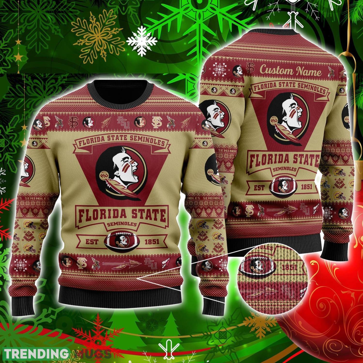 Whether you’re heading to a Christmas party, watching the game from home, or simply spreading some holiday cheer, our Florida State Seminoles Football Team Logo Personalized Ugly Christmas Sweater is a must-have addition to your wardrobe. It’s the perfect way to combine your love for the Seminoles with the festive spirit of Christmas.