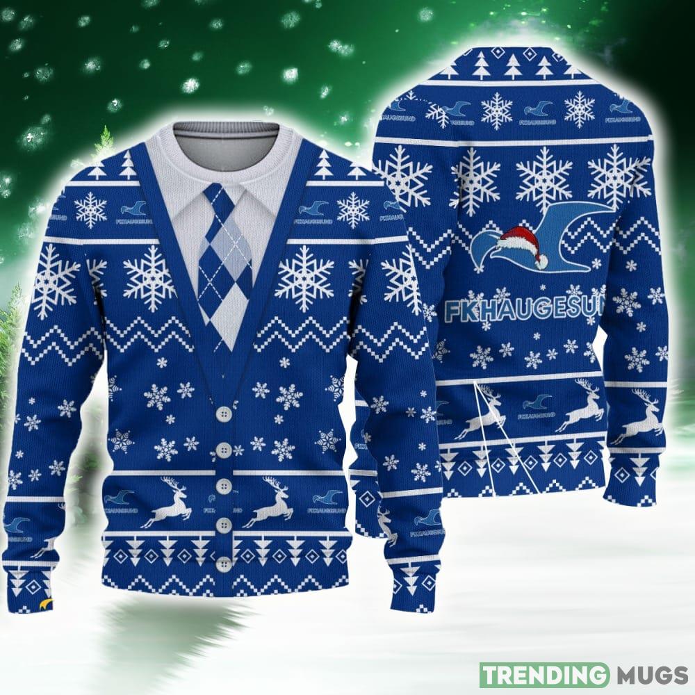 Available in men’s sizes, this Football Club Haugesund Eliteserien Santa Hat Logo Ugly Christmas Sweater is the perfect gift for any football enthusiast or holiday lover. Whether you’re treating yourself or surprising a loved one, this sweater is bound to be a hit.