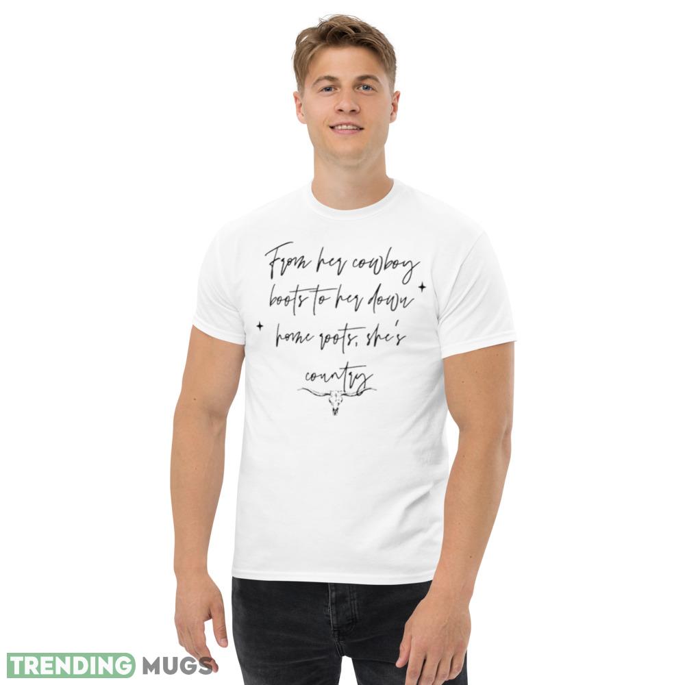 Featuring the iconic phrase “From her cowboy boots to her down home roots she’s country,” these t-shirts are sure to turn heads and start conversations wherever you go. Whether you’re wearing them to a country music festival, a rodeo, or just out and about in your hometown, they’re the perfect way to show off your southern charm and country pride.