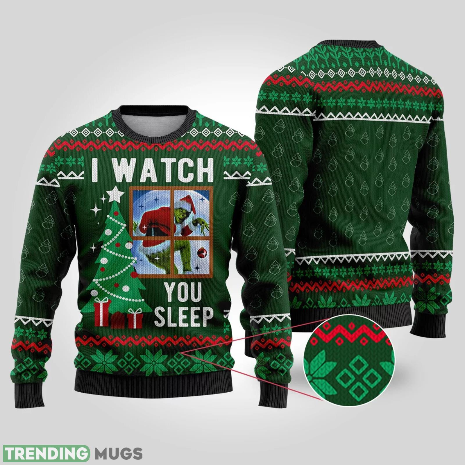 Designed with a playful twist on the classic Santa Claus and the mischievous Grinch, this sweater is a guaranteed conversation-starter at any holiday gathering. The combination of the iconic characters and the whimsical “I Watch You Sleep” slogan creates a light-hearted and amusing design that will bring smiles and laughter to everyone around.