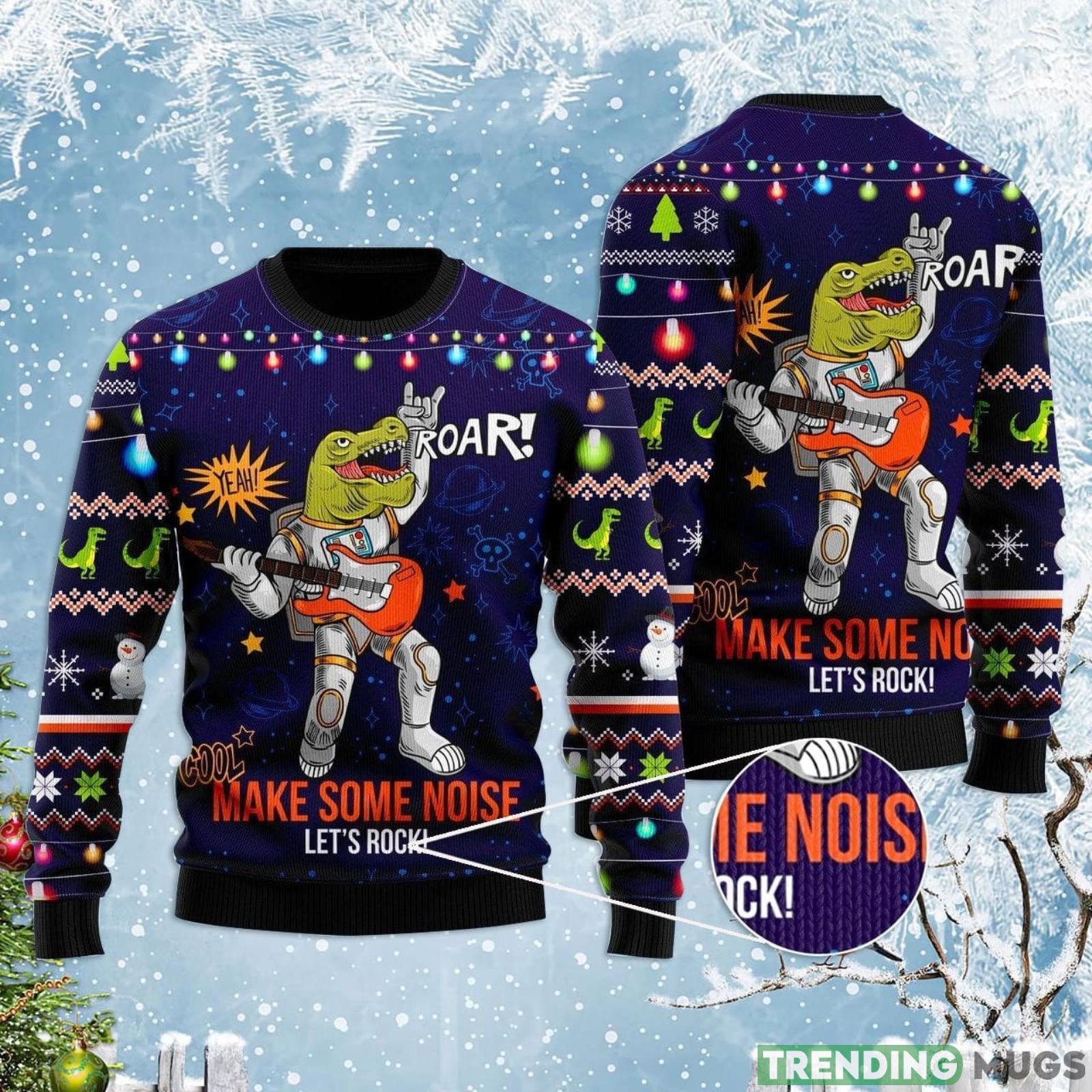 Funny T-rex Play Rock Music Between Stars Planets Galaxies Ugly Christmas Sweater Informations: