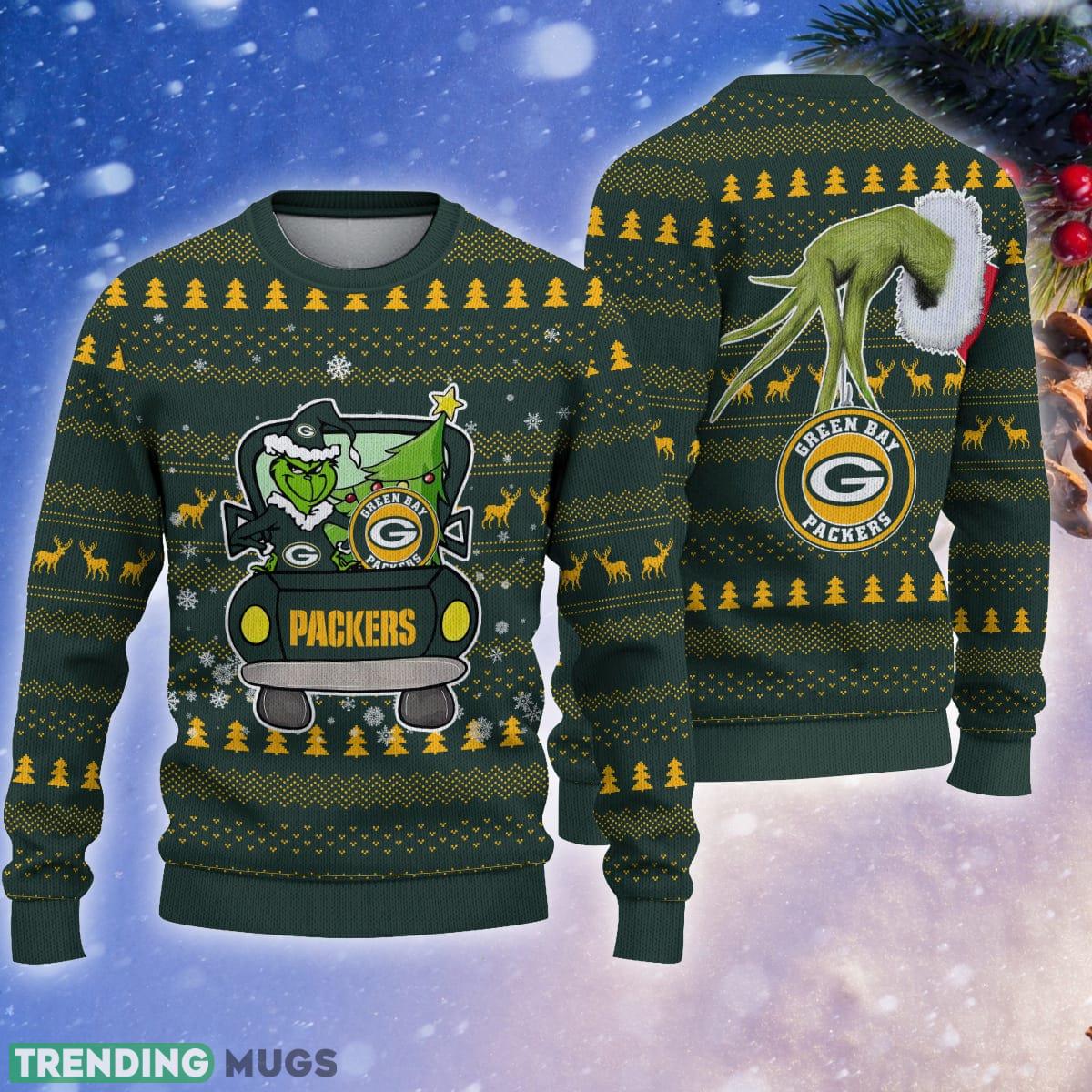 Green Bay Packers And Grinch Driving With Pine Trees Knitted Xmas Sweater AOP Holidays Gift 3D Sweater