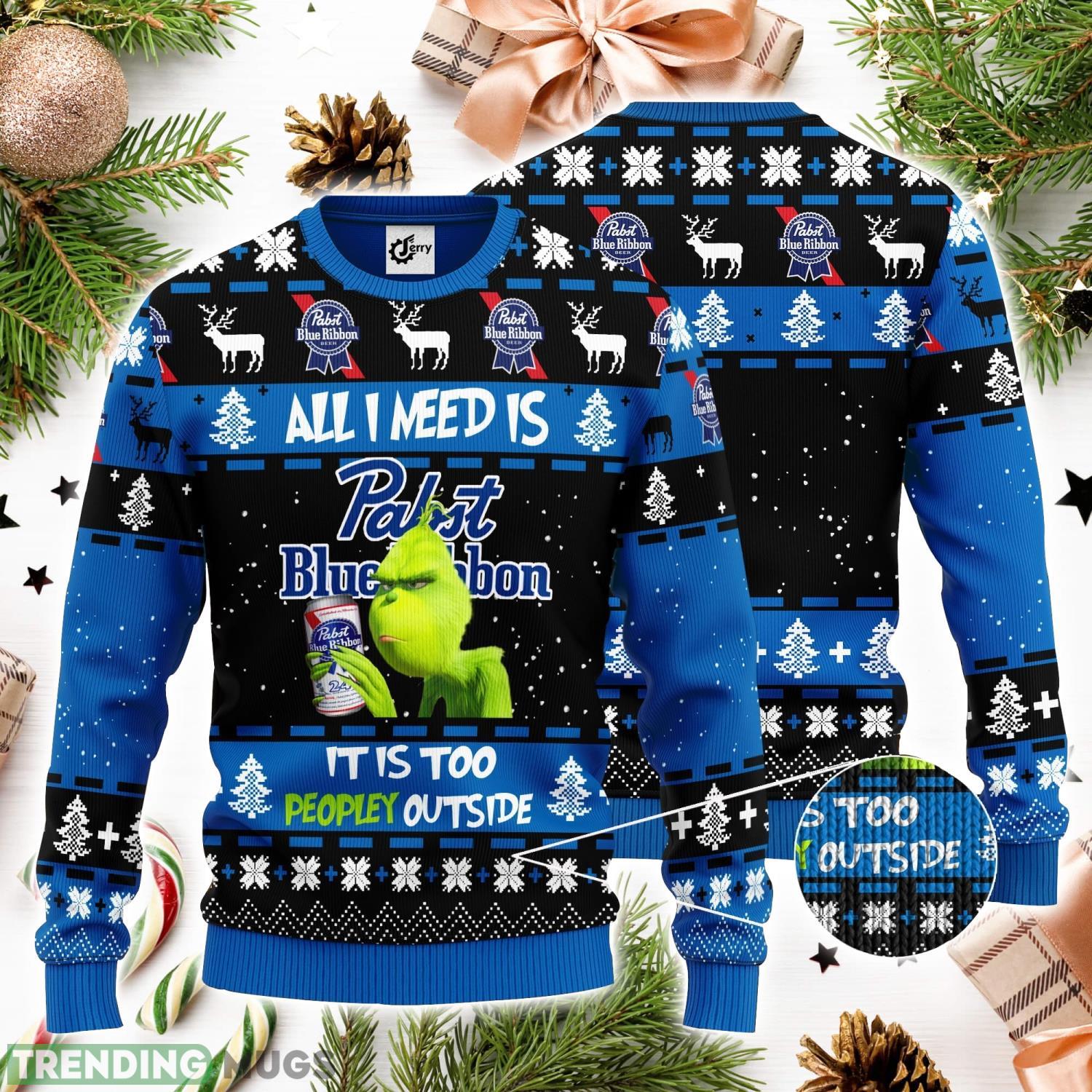 The Grinch All I Need Is Pabst Blue Ribbon It Is Too Peopley Outside 3D Ugly Christmas Sweater is the perfect way to showcase your love for the holiday season while making a bold and hilarious statement. Designed as a unisex sweater, it makes for an ideal Christmas gift for anyone with a sense of humor.