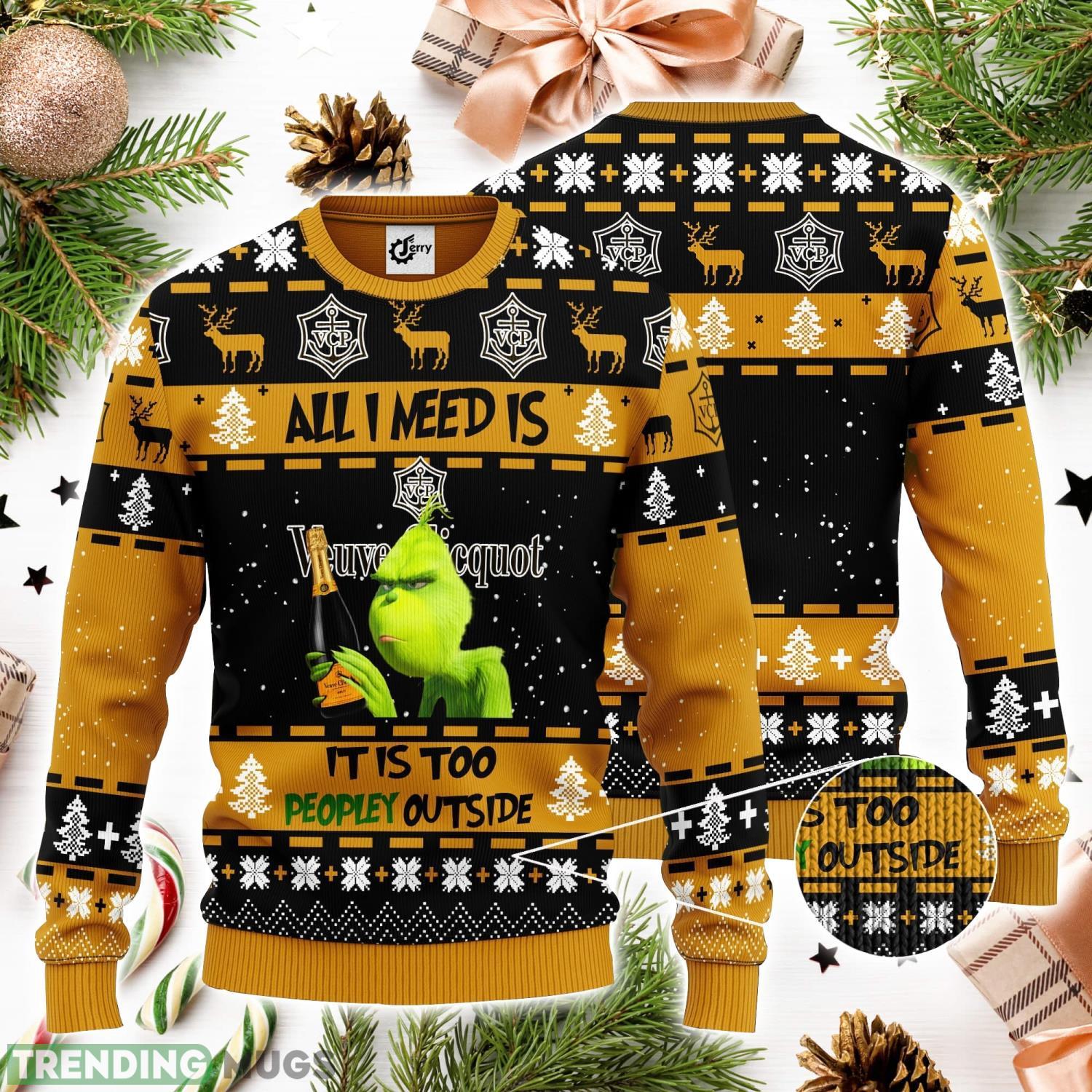 Designed with the iconic Grinch image and the hilarious phrase “All I Need Is Veuve Clicquot It Is Too Peopley Outside,” this sweater is guaranteed to bring a smile to your face and those around you. Made from high-quality materials, it ensures both comfort and durability throughout the festive season.