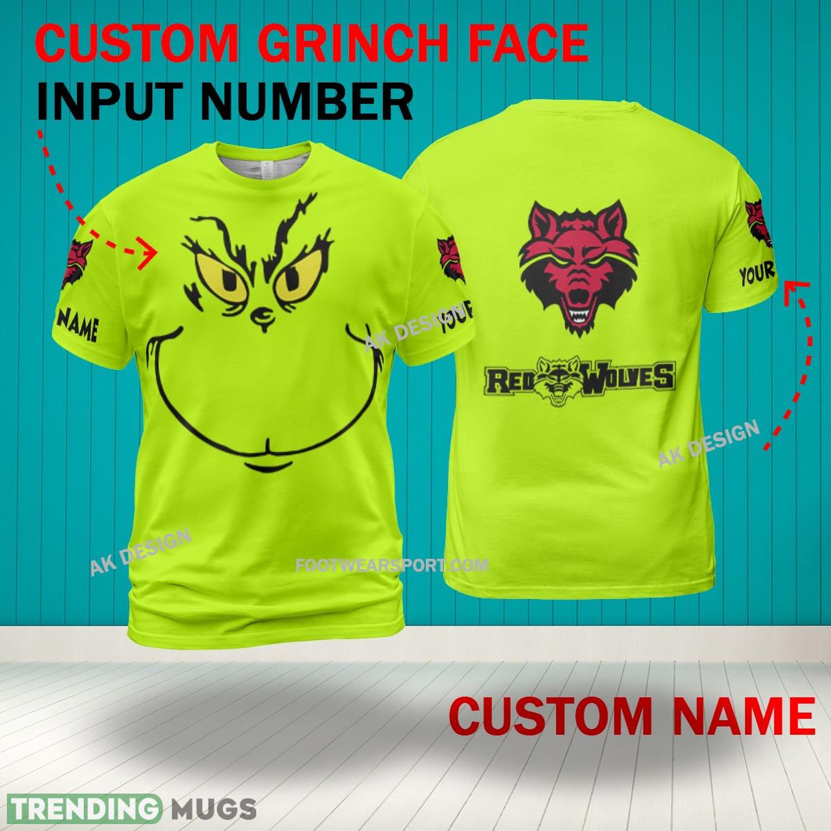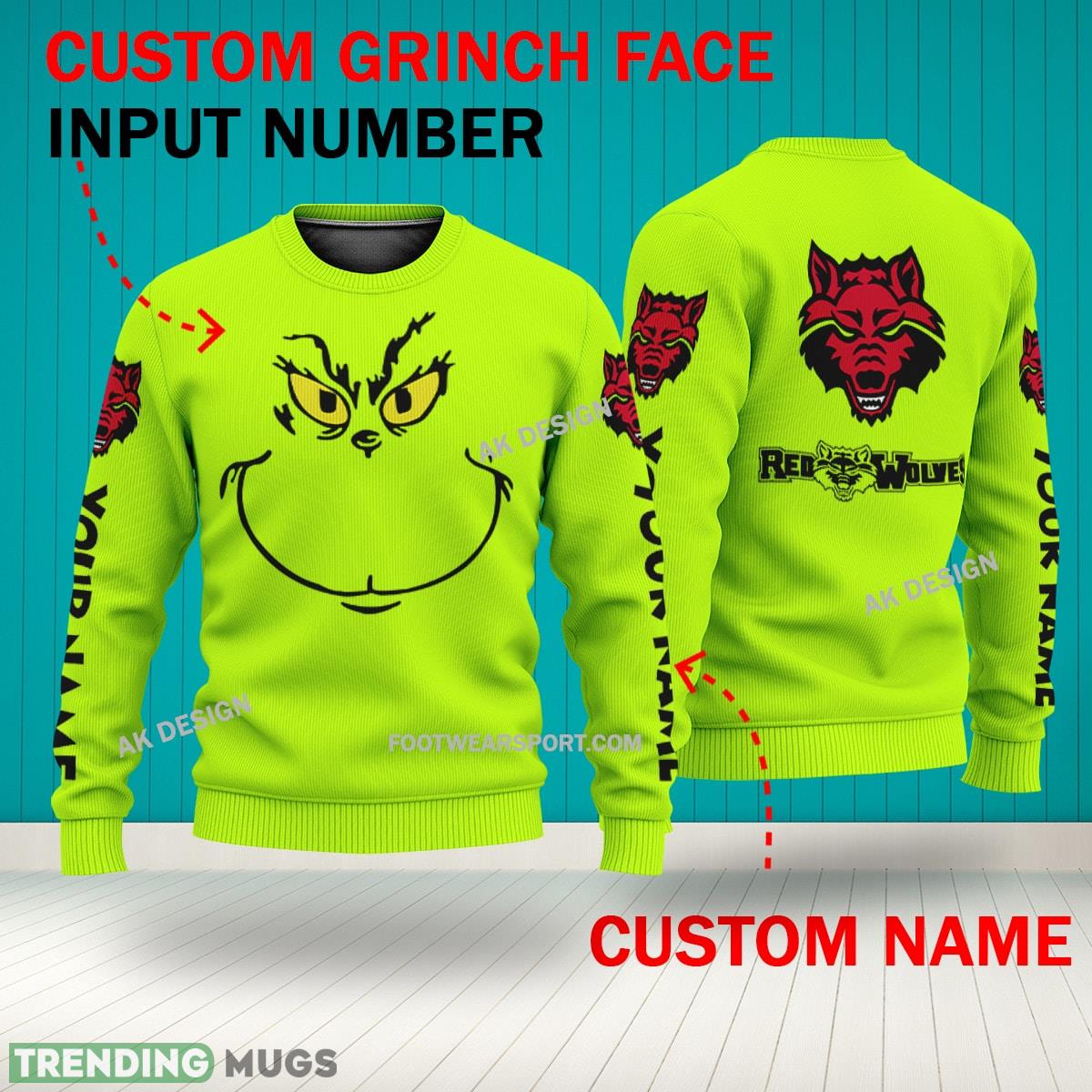 Grinch Face Arkansas State Red Wolves 3D Hoodie, Zip Hoodie, Sweater Green AOP Custom Number And Name – Grinch Face NCAA Arkansas State Red Wolves 3D Shirt
