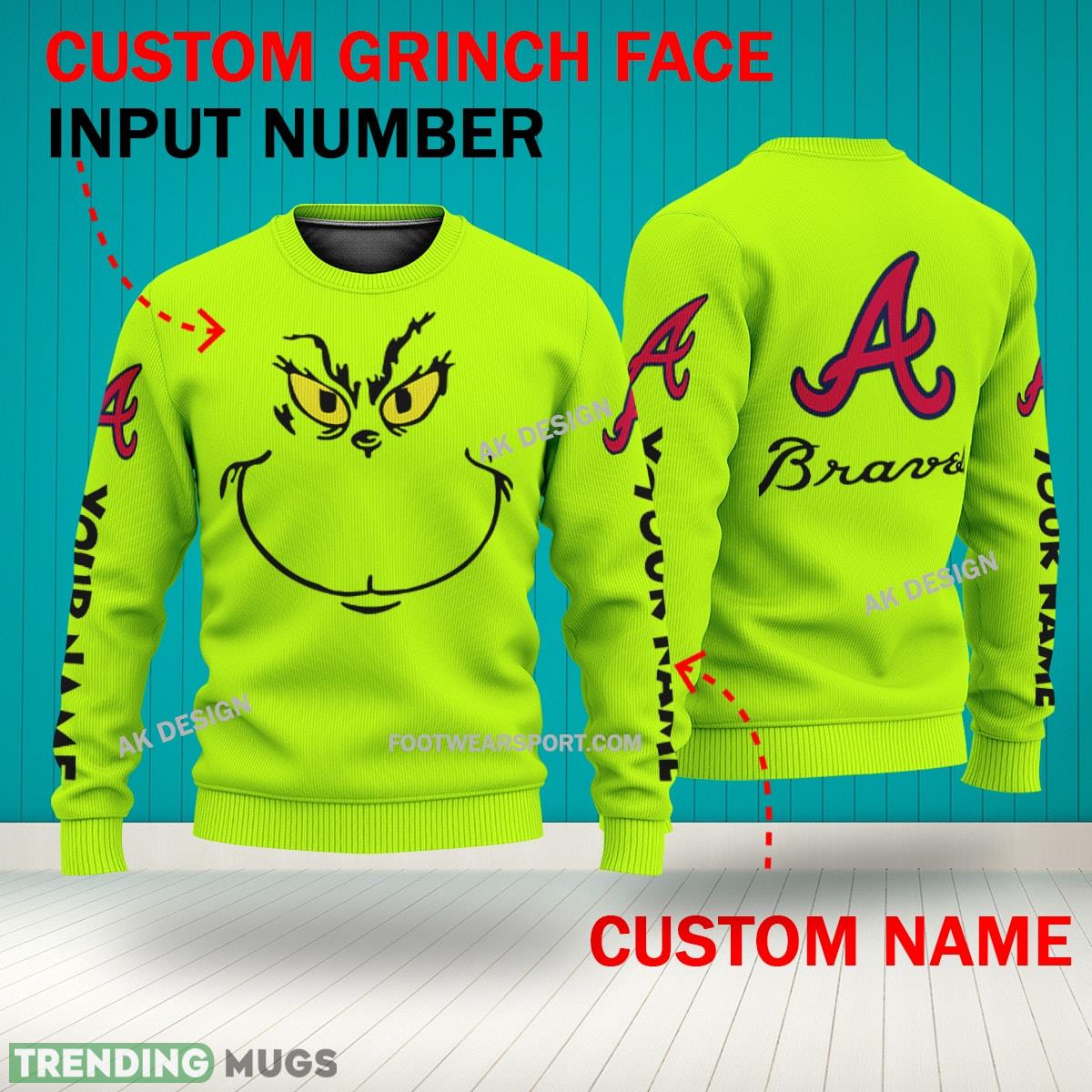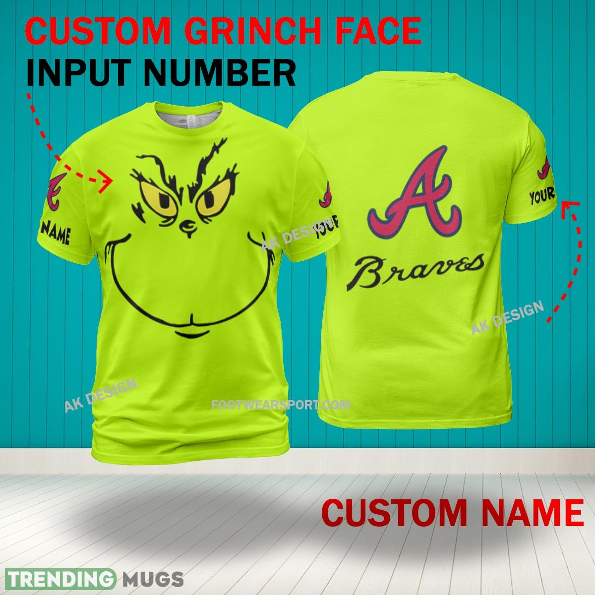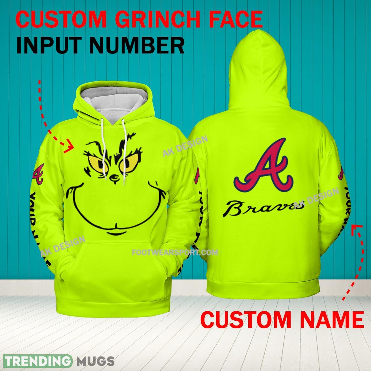 • Grinch Face Atlanta Braves 3D Hoodie, Zip Hoodie, Sweater Green AOP Custom Number And Name 3D Hoodies