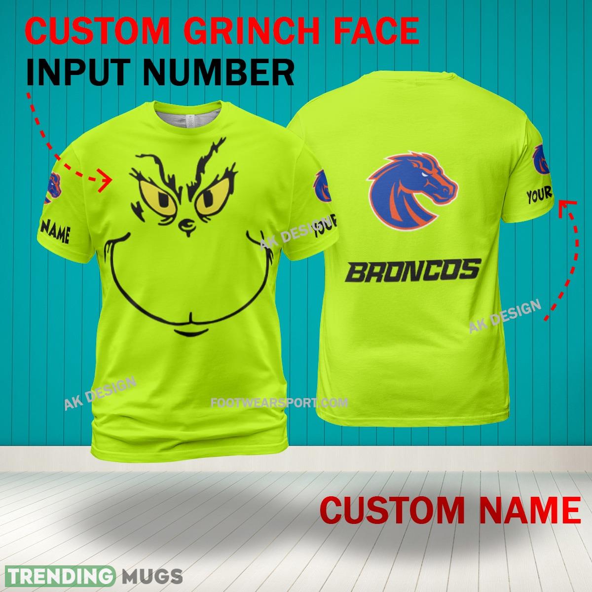 Some of the Grinch Face Boise State Broncos 3D Hoodie, Zip Hoodie, Sweater Green AOP Custom Number And Name photos