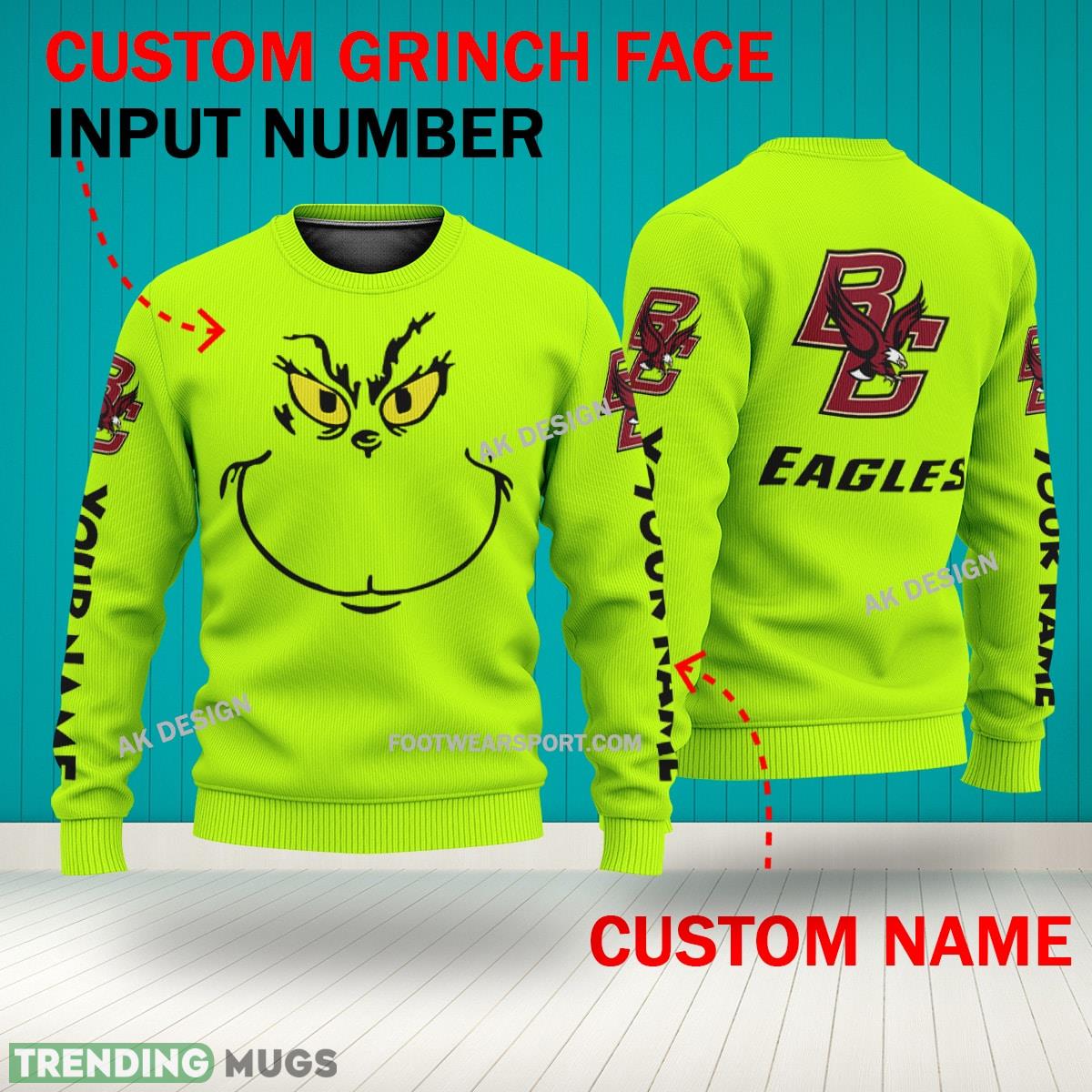 • Grinch Face Boston College Eagles 3D Hoodie, Zip Hoodie, Sweater Green AOP Custom Number And Name 3D Hoodies