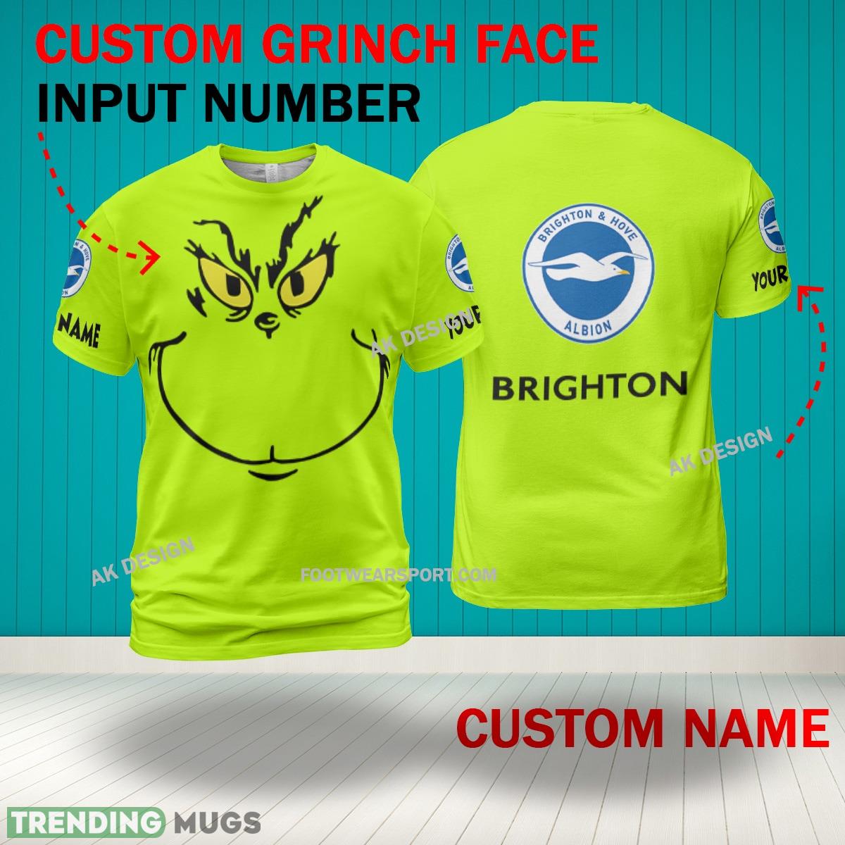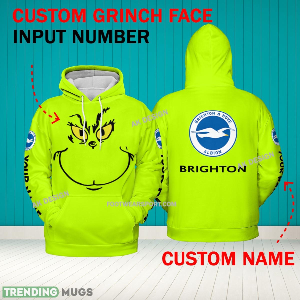Grinch Face Brighton & Hove Albion 3D Hoodie, Zip Hoodie, Sweater Green AOP Custom Number And Name – Grinch Face EPL Brighton & Hove Albion Custom Face 1