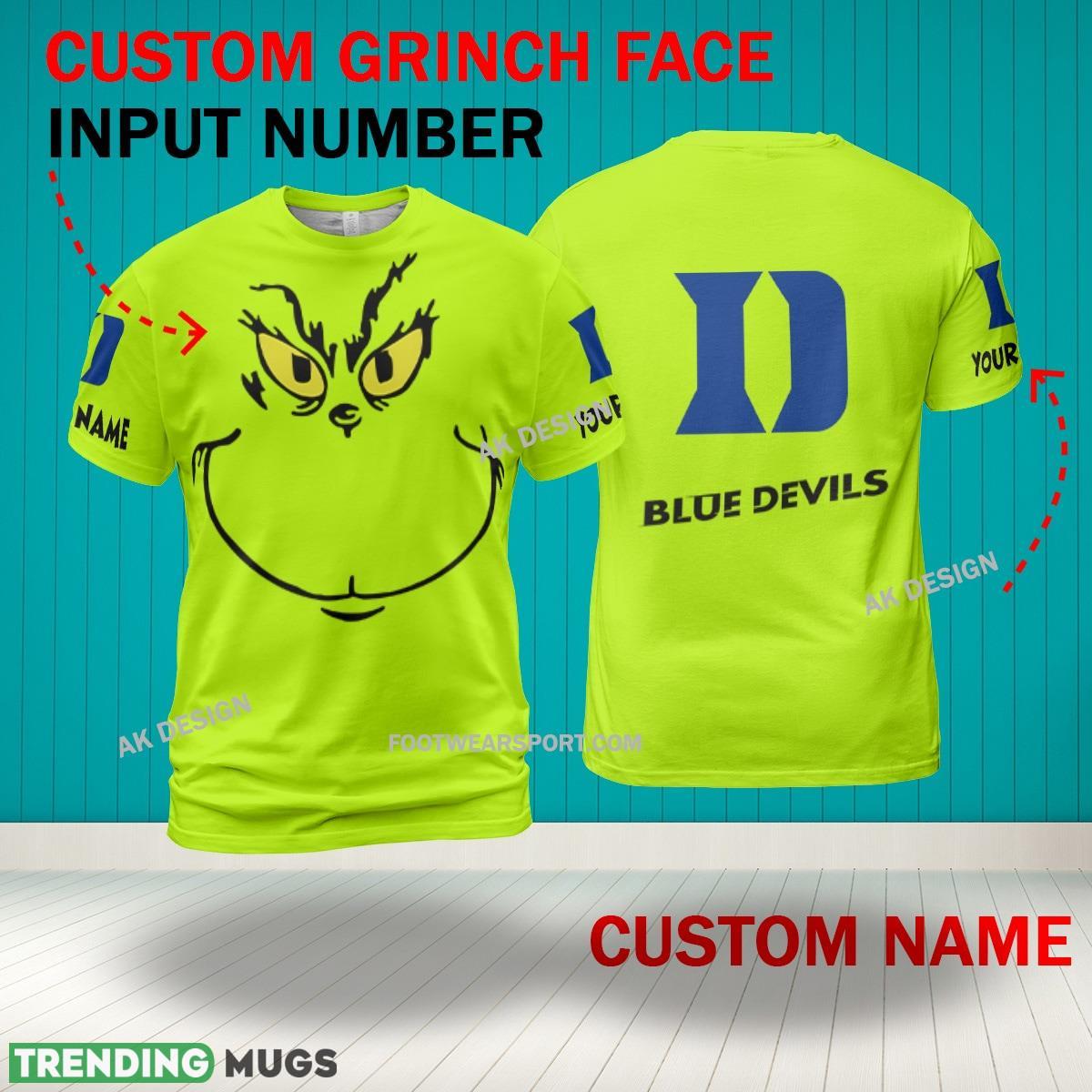 Some of the Grinch Face Duke Blue Devils 3D Hoodie, Zip Hoodie, Sweater Green AOP Custom Number And Name photos