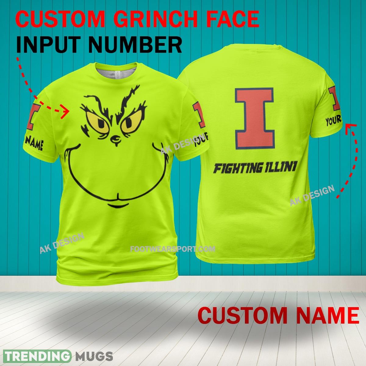 Grinch Face Illinois Fighting Illini 3D Hoodie, Zip Hoodie, Sweater Green AOP Custom Number And Name – Grinch Face NCAA Illinois Fighting Illini Custom Face 1