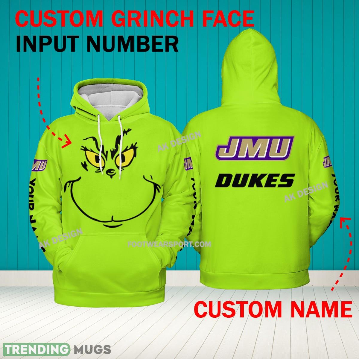 Grinch Face James Madison Dukes 3D Hoodie, Zip Hoodie, Sweater Green AOP Custom Number And Name Information