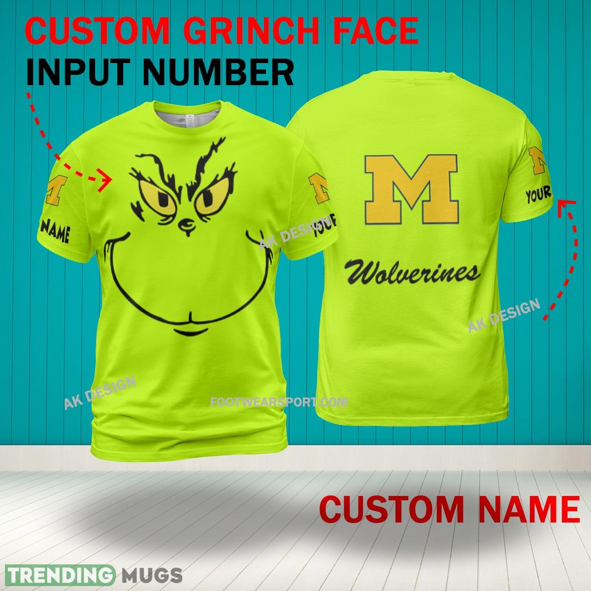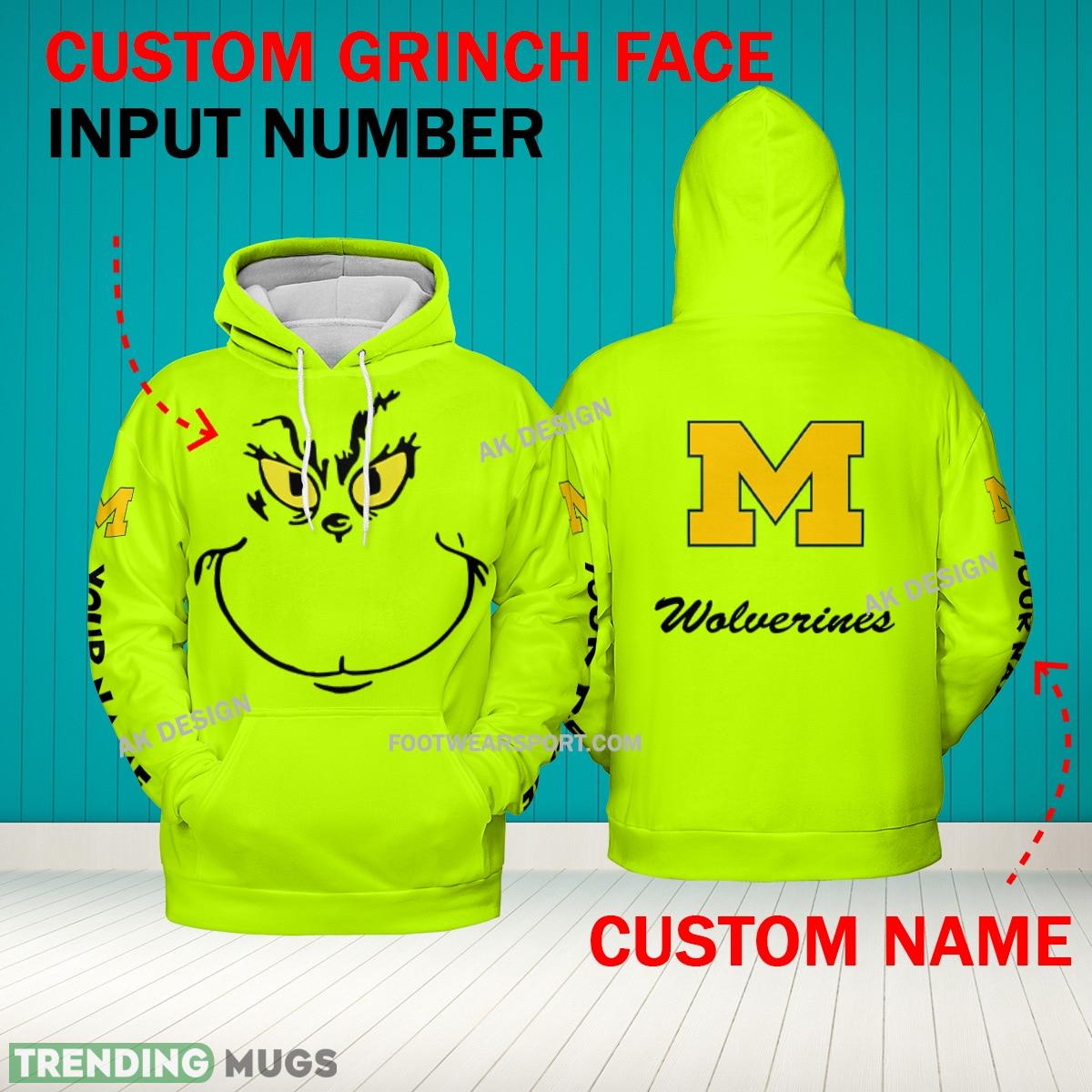 Some of the Grinch Face Michigan Wolverines 3D Hoodie, Zip Hoodie, Sweater Green AOP Custom Number And Name photos