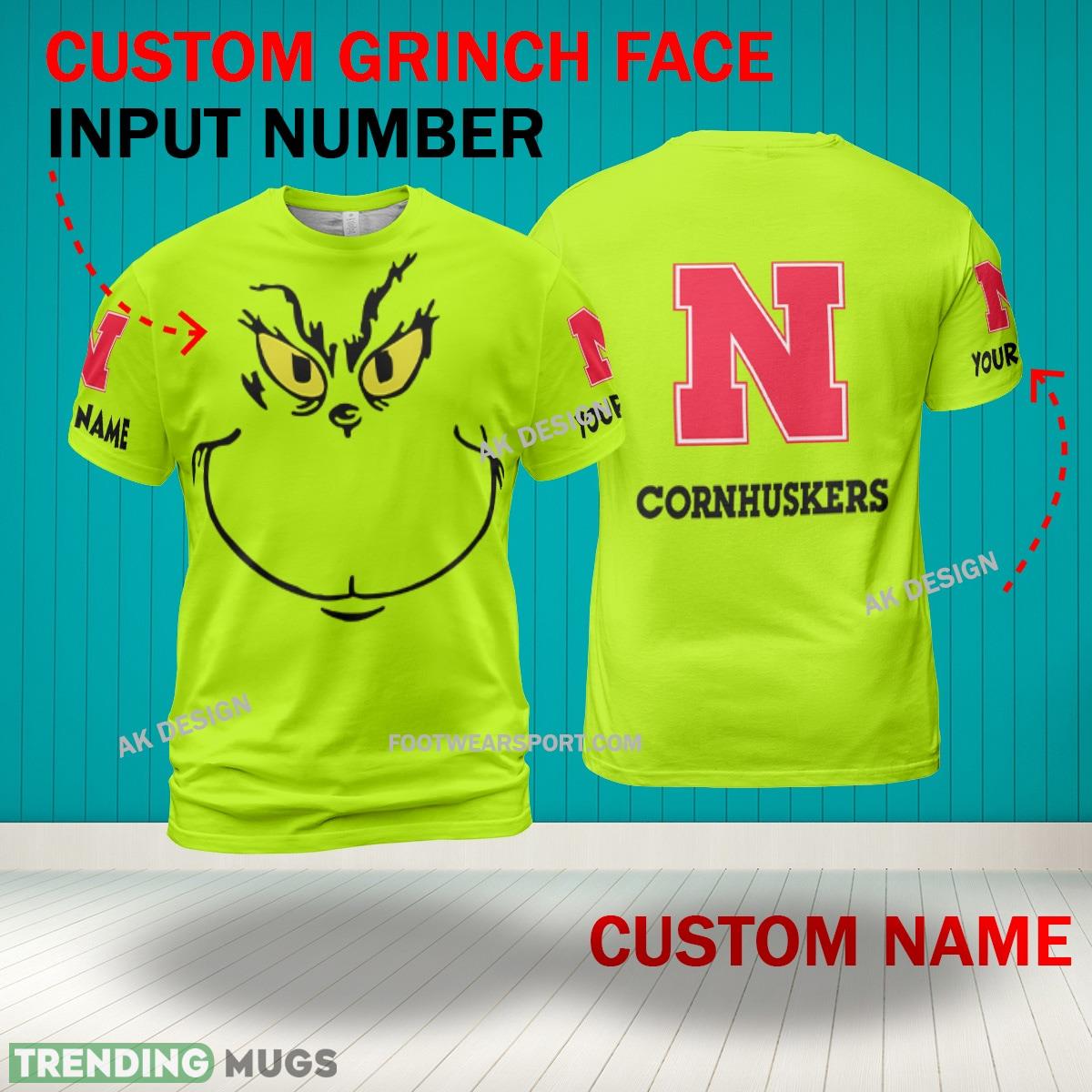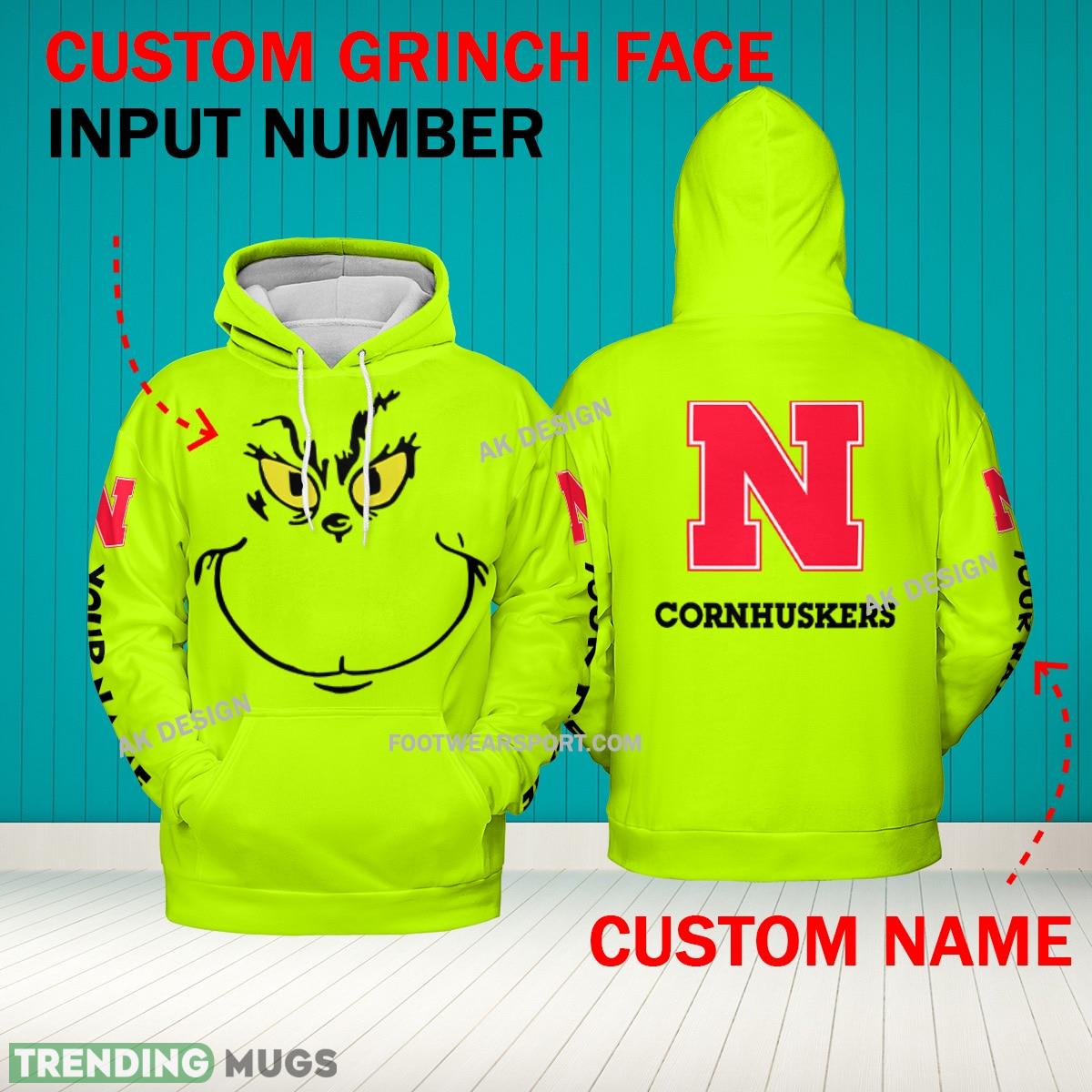Grinch Face Nebraska Cornhuskers 3D Hoodie, Zip Hoodie, Sweater Green AOP Custom Number And Name – Grinch Face NCAA Nebraska Cornhuskers 3D Shirt