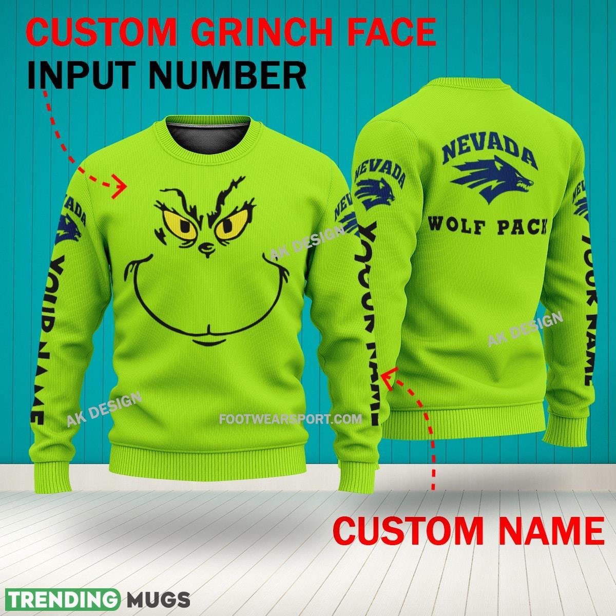 Grinch Face Nevada Wolf Pack 3D Hoodie, Zip Hoodie, Sweater Green AOP Custom Number And Name – Grinch Face NCAA Nevada Wolf Pack 3D Sweater