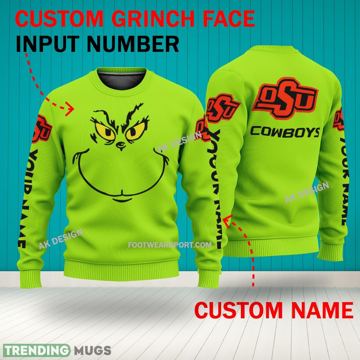 Grinch Face Oklahoma State Cowboys 3D Hoodie, Zip Hoodie, Sweater Green AOP Custom Number And Name – Grinch Face NCAA Oklahoma State Cowboys 3D Shirt