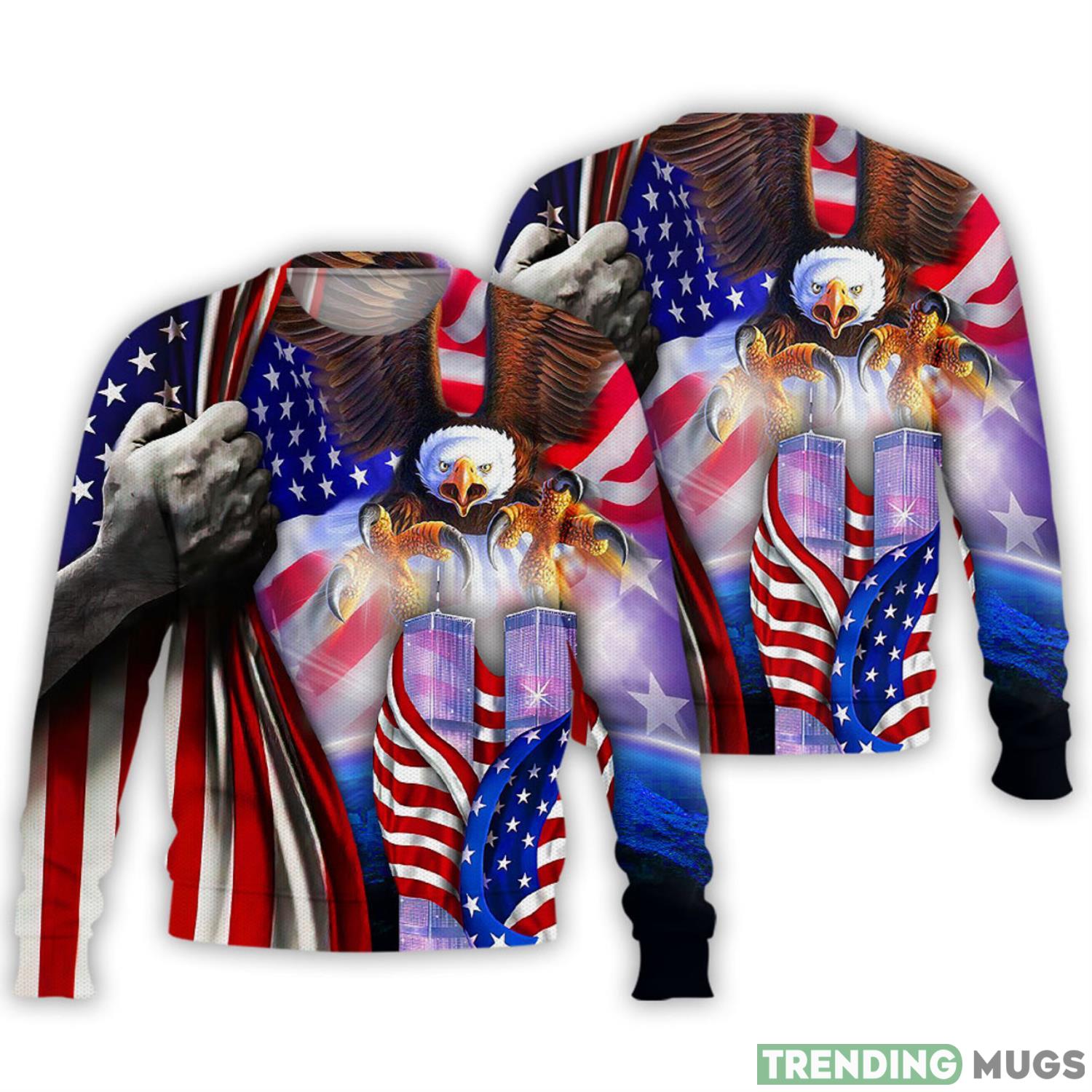 Crafted with utmost attention to detail, our sweater features a striking design that showcases a majestic bald eagle proudly clutching the American flag with the iconic Twin Towers in the background. This powerful imagery serves as a reminder of the strength and resilience of our nation.