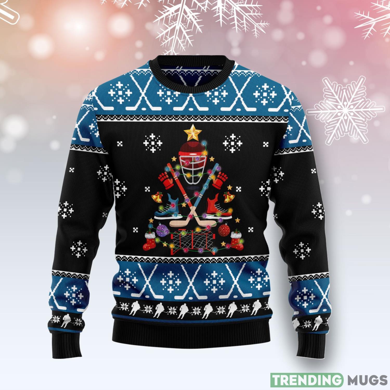 Featuring a unique design, this sweater boasts a vibrant Christmas tree adorned with hockey sticks, pucks, and skates, making it a must-have for any hockey enthusiast. The combination of traditional Christmas elements and your favorite sport creates a one-of-a-kind look that is sure to turn heads at any holiday gathering.