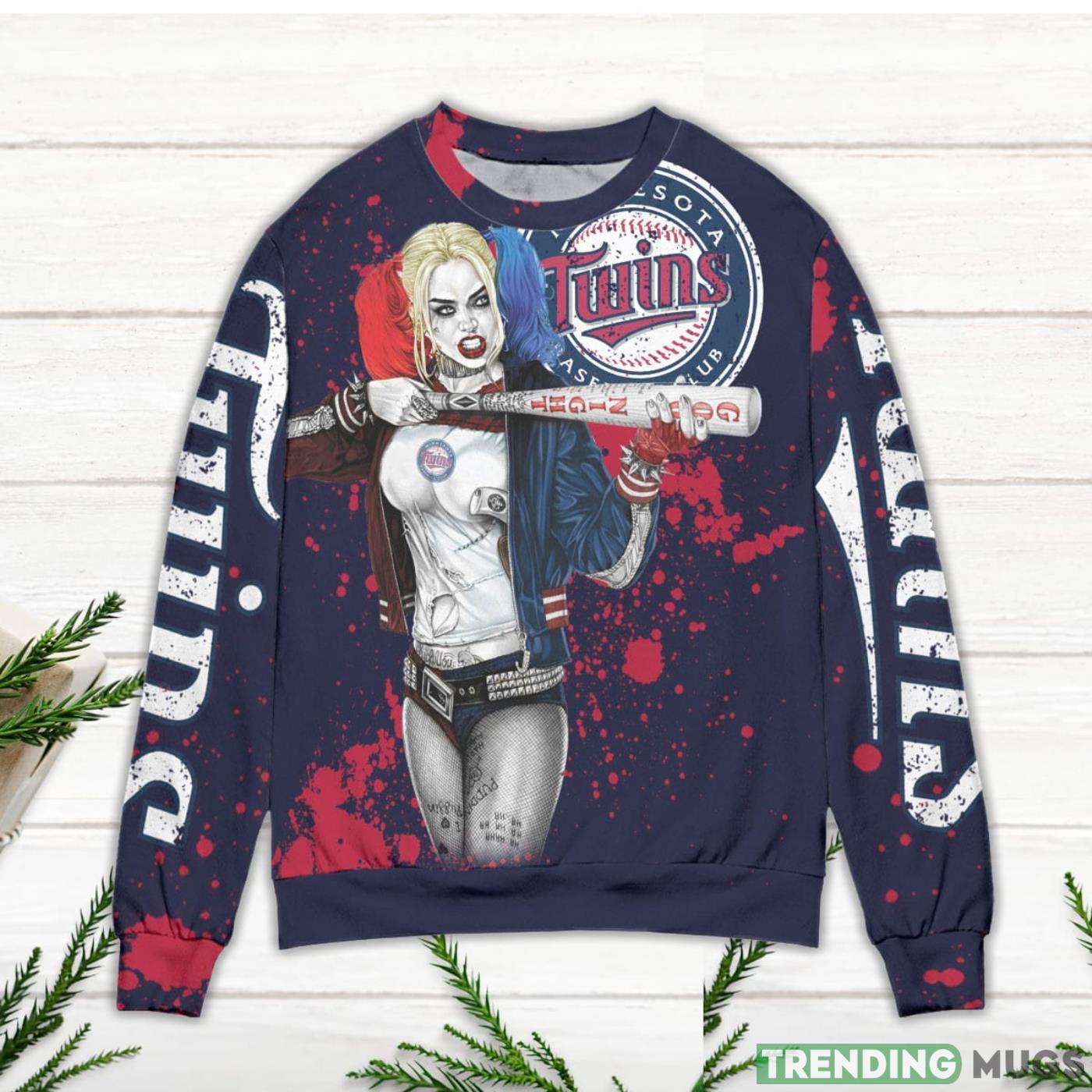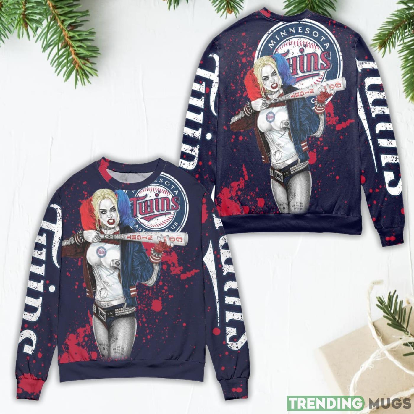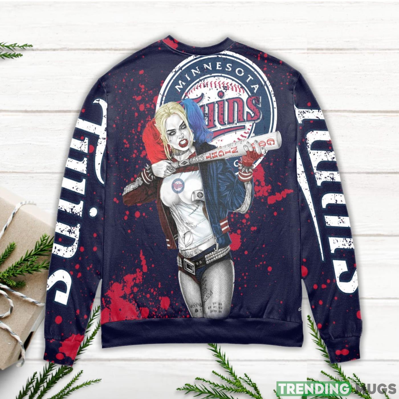 Harley Quinn Minnesota Twins Ugly Christmas Sweater. This officially licensed Minnesota Twins ugly Christmas sweater is the perfect way to show your support for your favorite team on deck this season! Made with a comfy, warm fabric, this ugly sweater is perfect for any fan who wants to add a little bit of fun and personality to their holiday attire. Whether you’re dressing up as Harley Quinn or just looking for some festive style, this Minnesota Twins ugly Christmas sweater is a must-have!