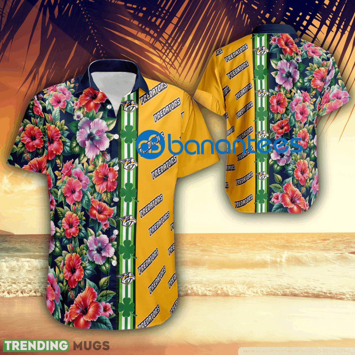 Featuring an all-over print of the Nashville Predators logo and hibiscus flowers, this shirt is sure to turn heads wherever you go. The combination of the team’s iconic logo with the festive St. Patrick’s Day theme creates a unique and exciting design that truly stands out from the crowd.
